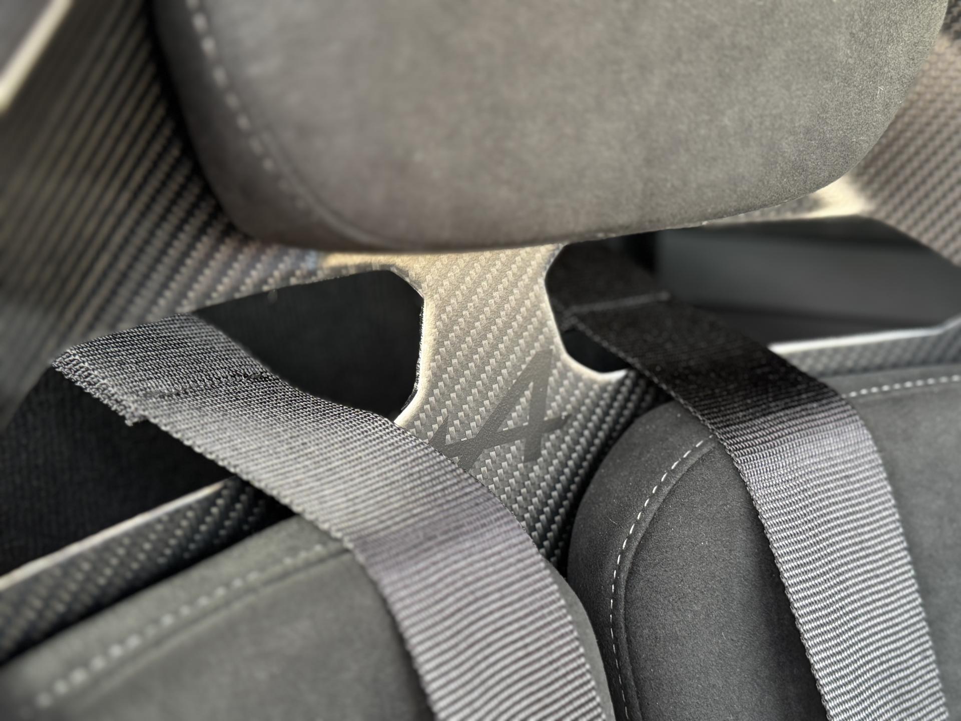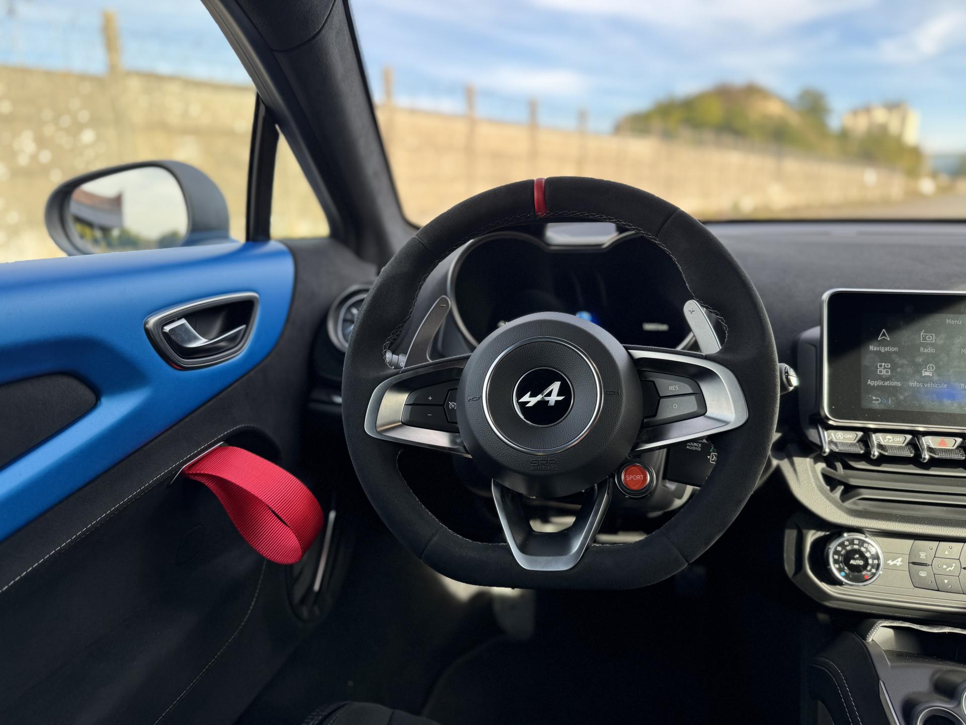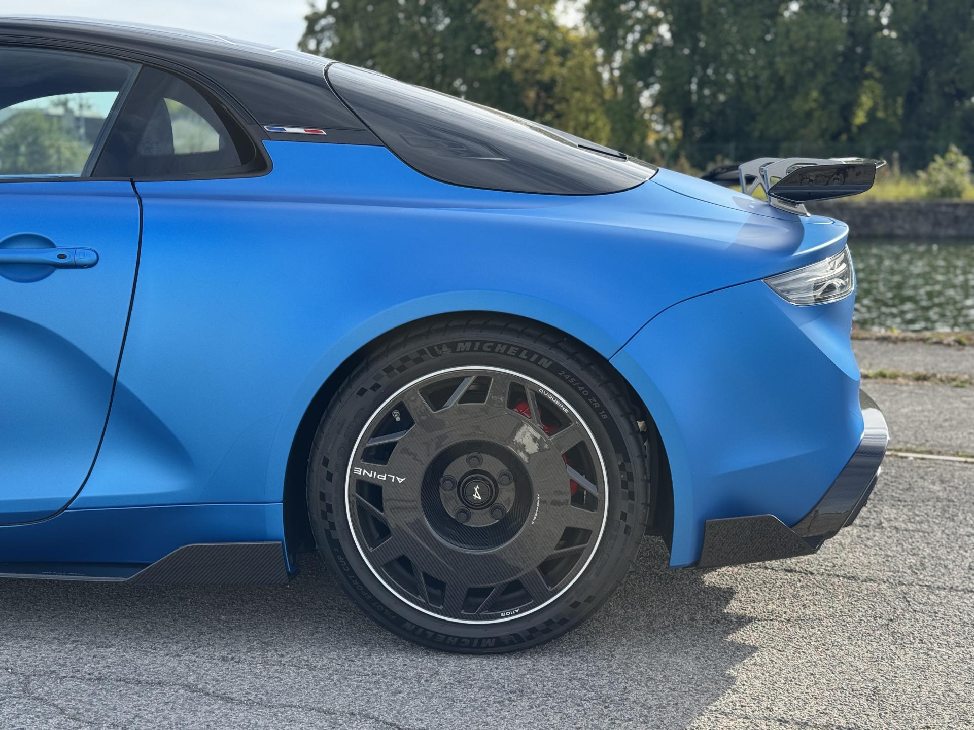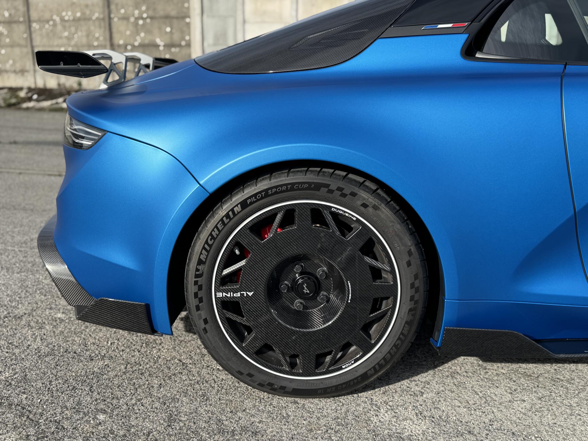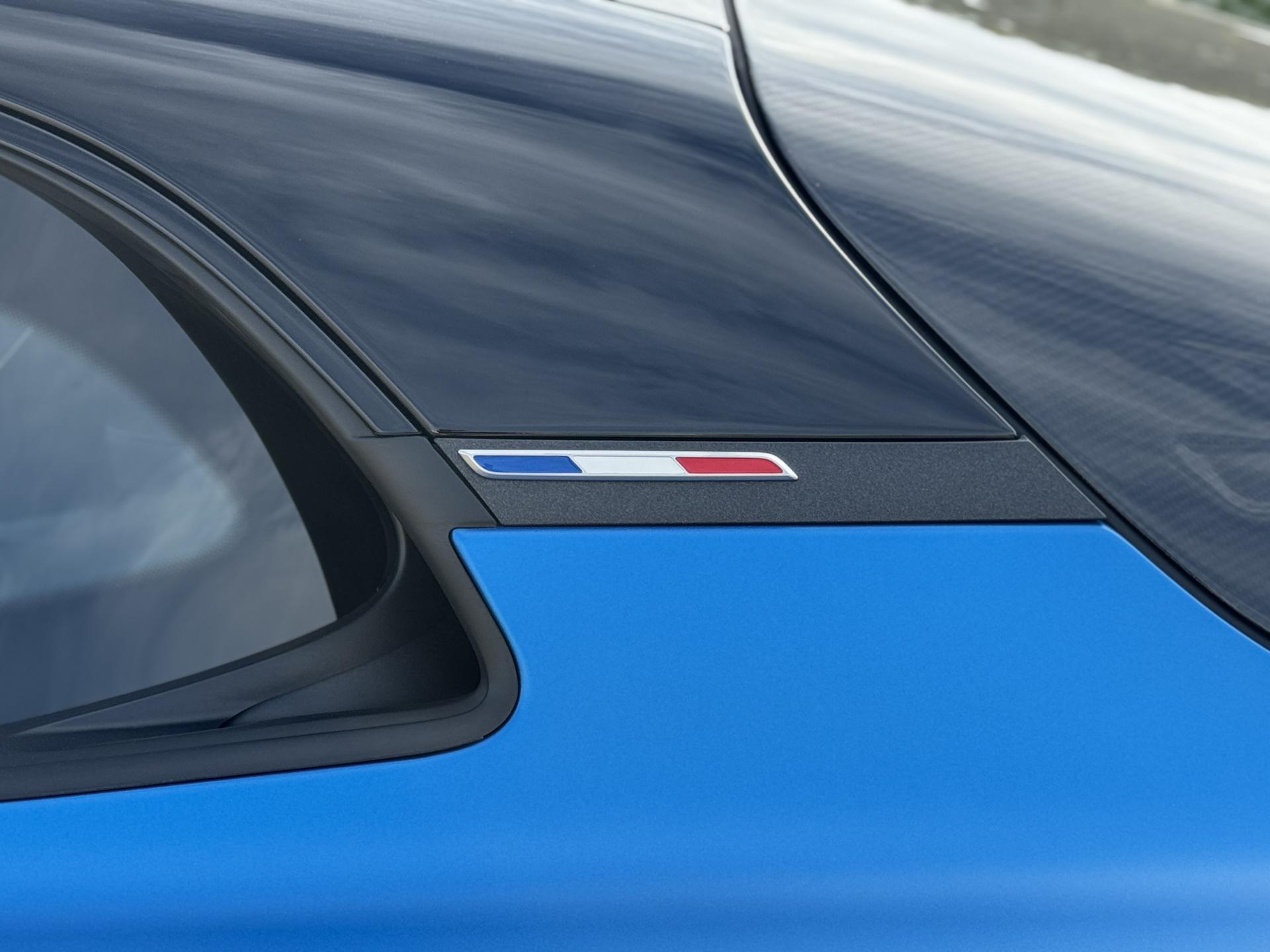 Parmi les options les plus prestigieuses, cette Alpine reçoit la peinture exclusive Bleu Racing Mat, le Pack Carbone R et le Kit Aéro R intégrant lame avant, diffuseur et aileron arrière pour un appui optimisé. Elle se distingue également par son logo A sur le toit et sa livrée French flag qui rappellent fièrement les origines de la marque.