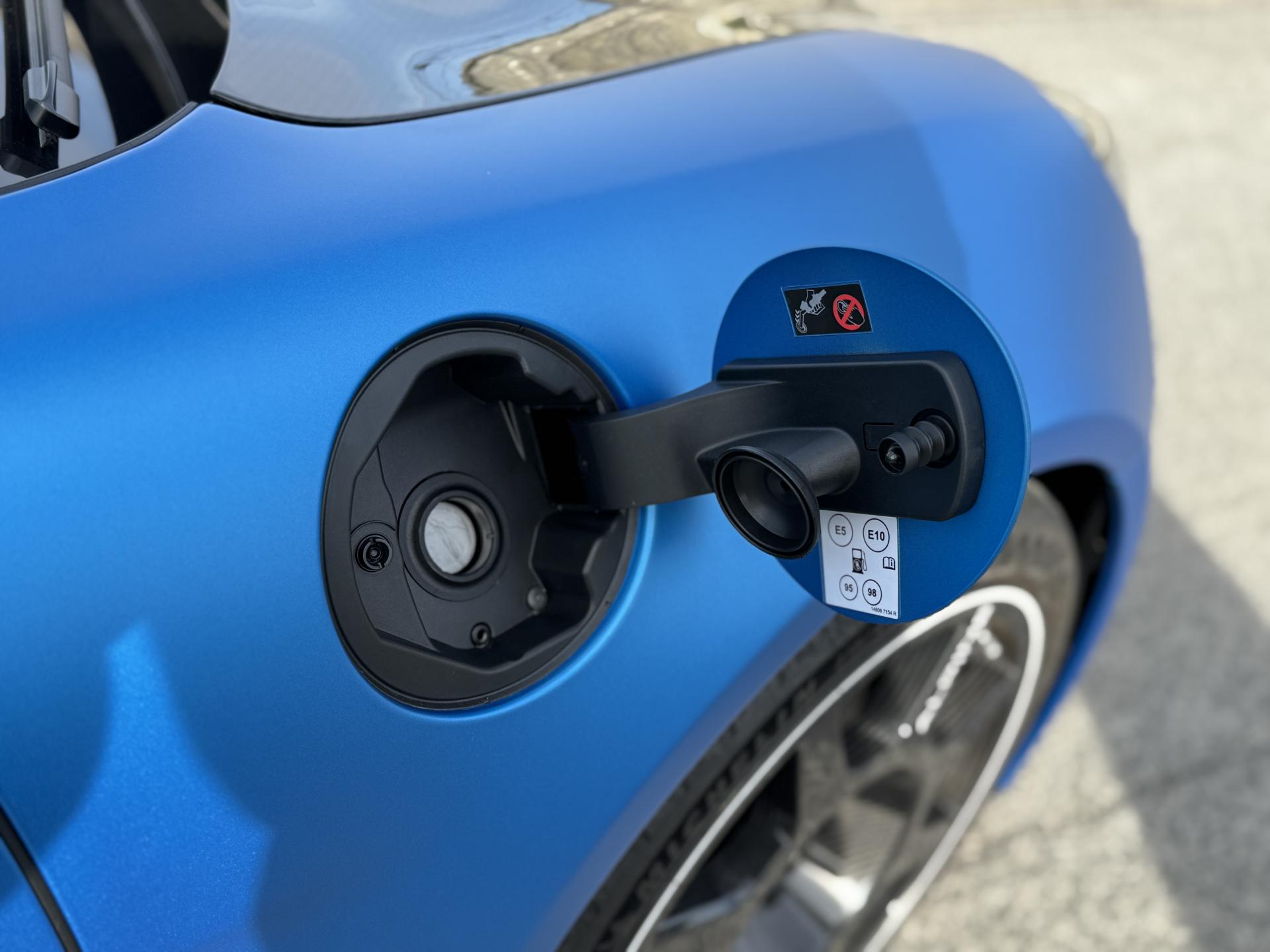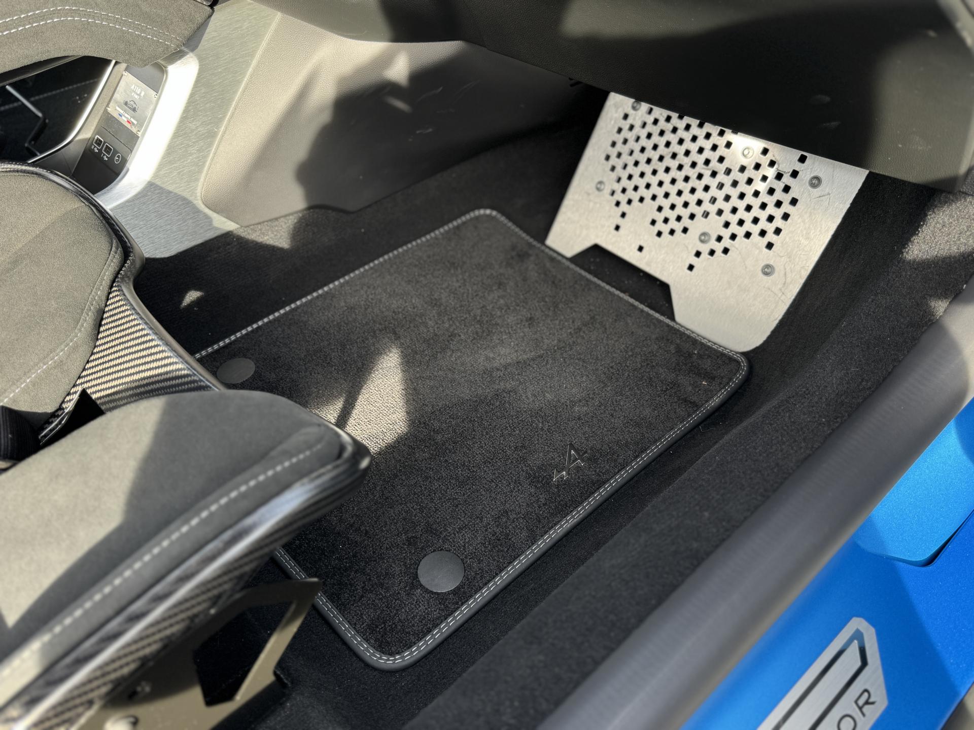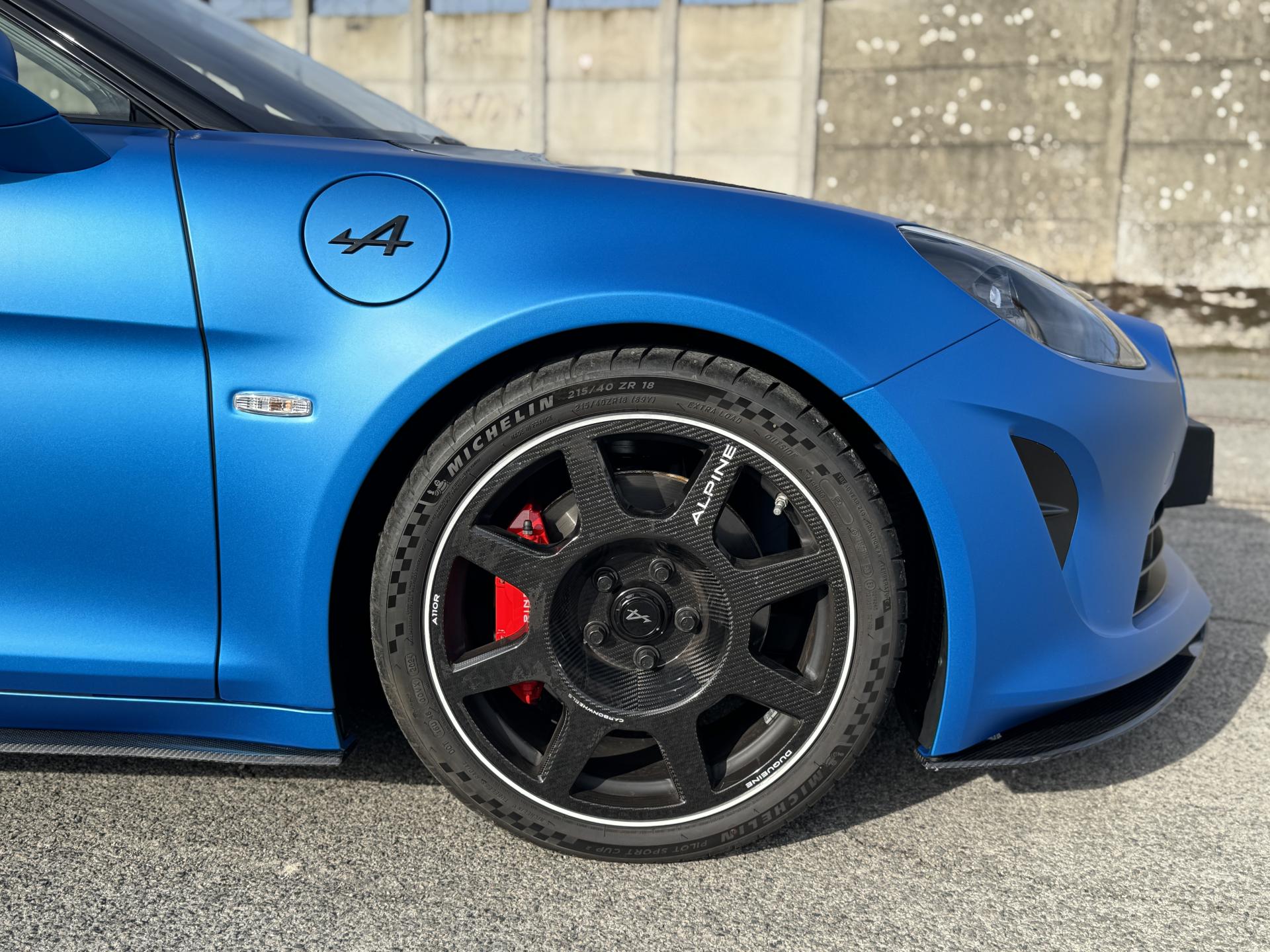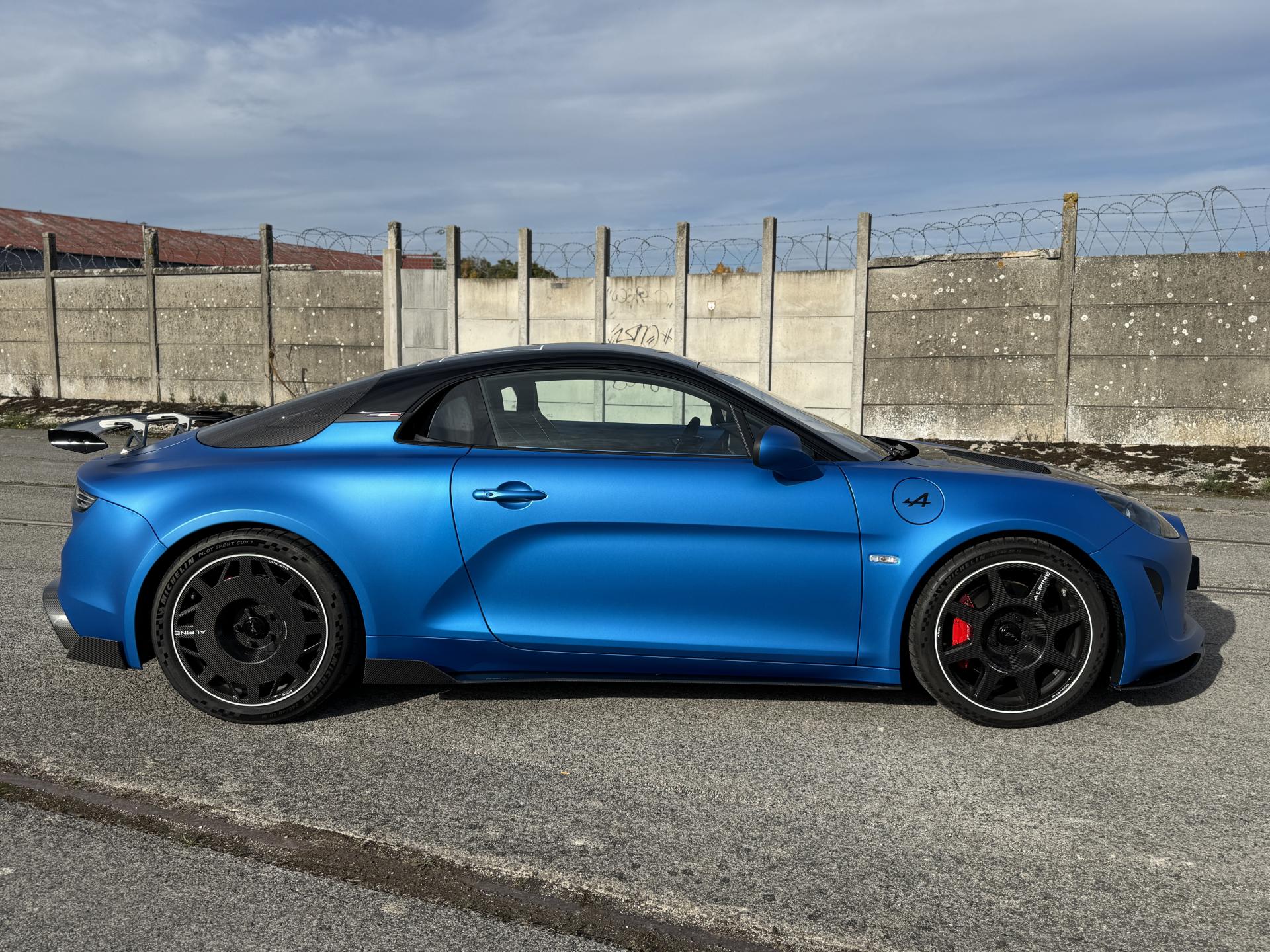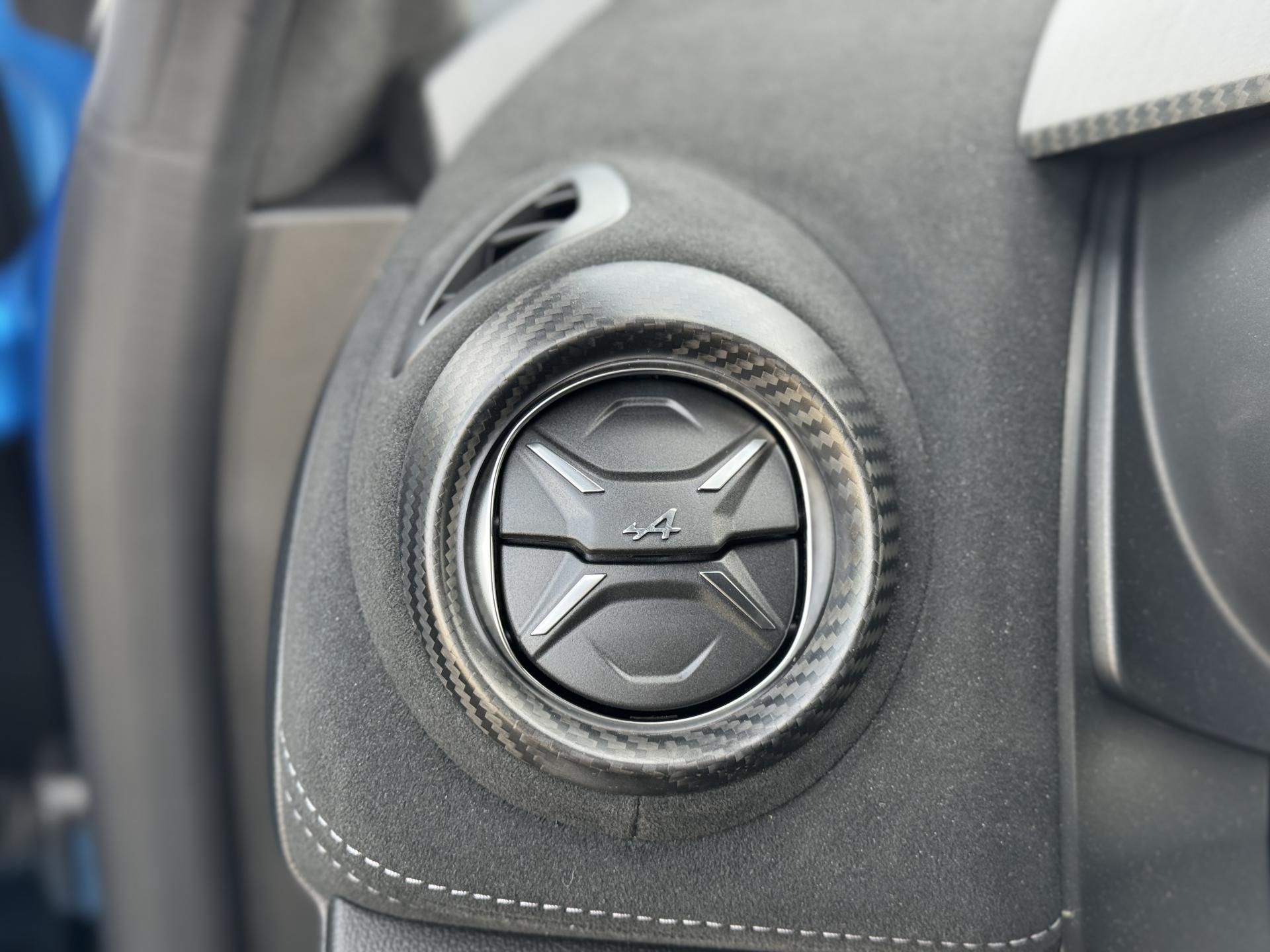 Parmi les options les plus prestigieuses, cette Alpine reçoit la peinture exclusive Bleu Racing Mat, le Pack Carbone R et le Kit Aéro R intégrant lame avant, diffuseur et aileron arrière pour un appui optimisé. Elle se distingue également par son logo A sur le toit et sa livrée French flag qui rappellent fièrement les origines de la marque.
