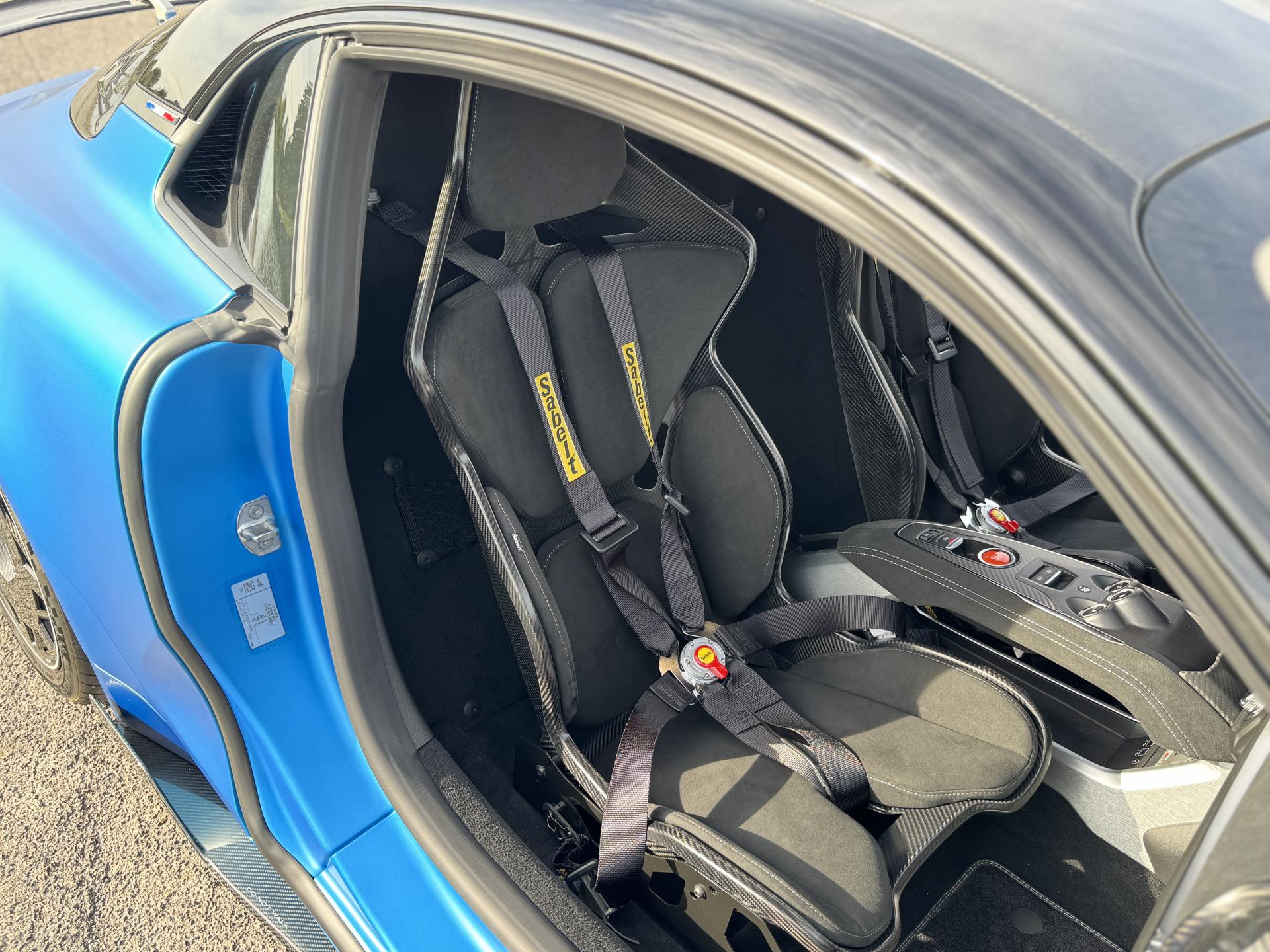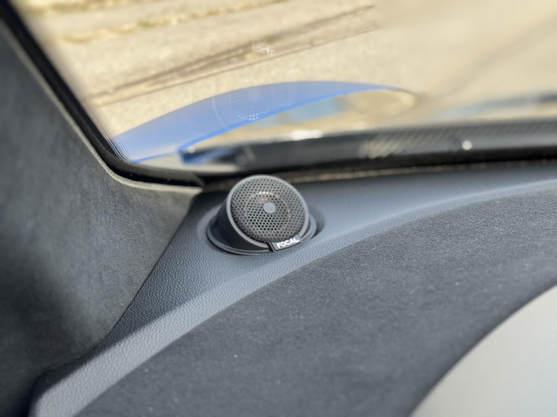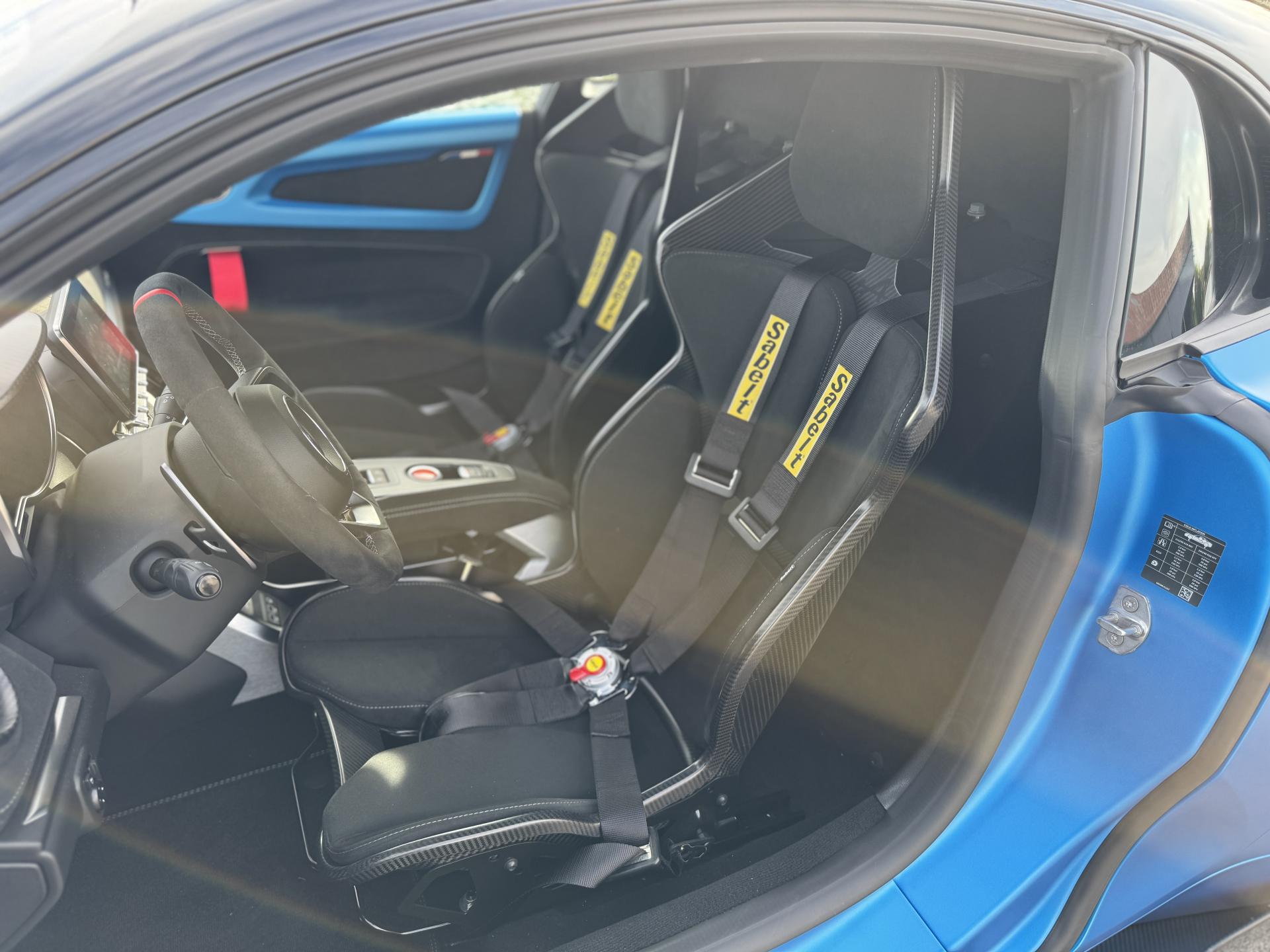 L’intérieur se distingue par les sièges baquets Sabelt en carbone, le pédalier et les palettes en aluminium ainsi que des finitions avec inserts carbone et surpiqûres contrastées. Côté confort et technologie, on retrouve le système multimédia Focal Premium.