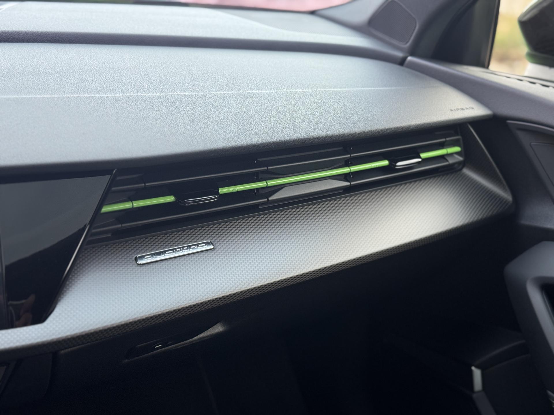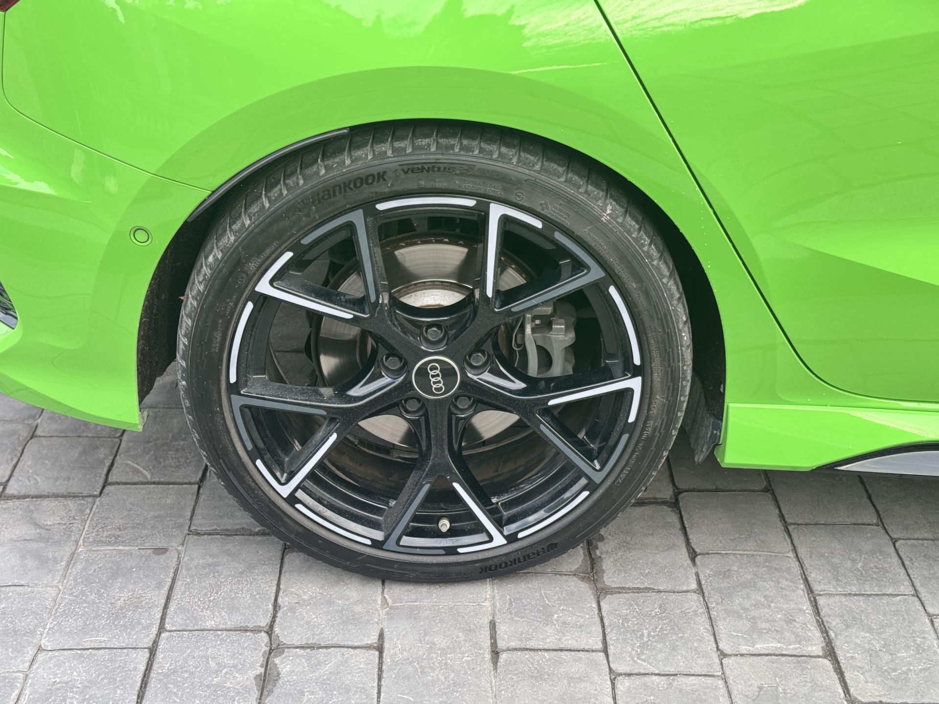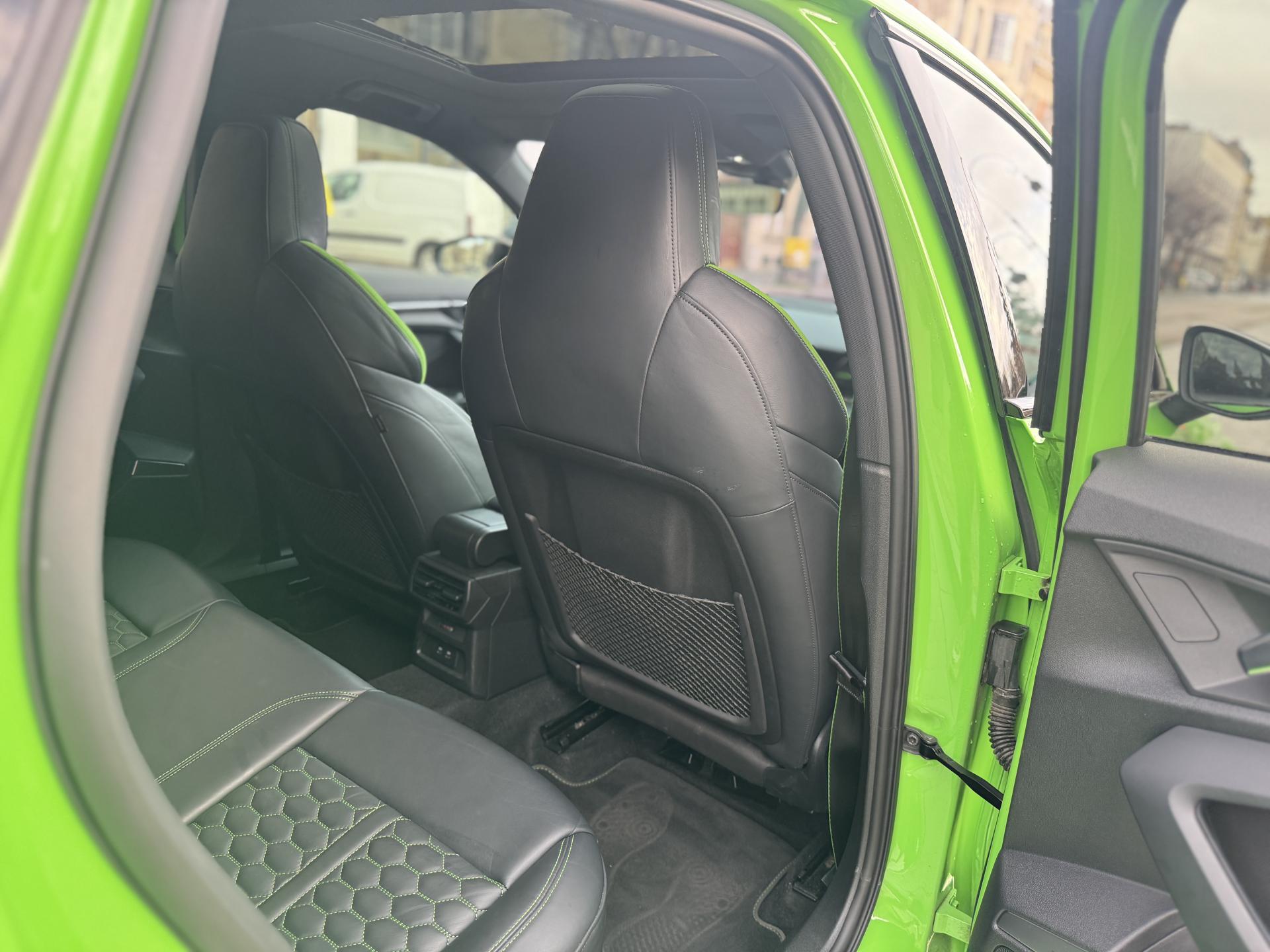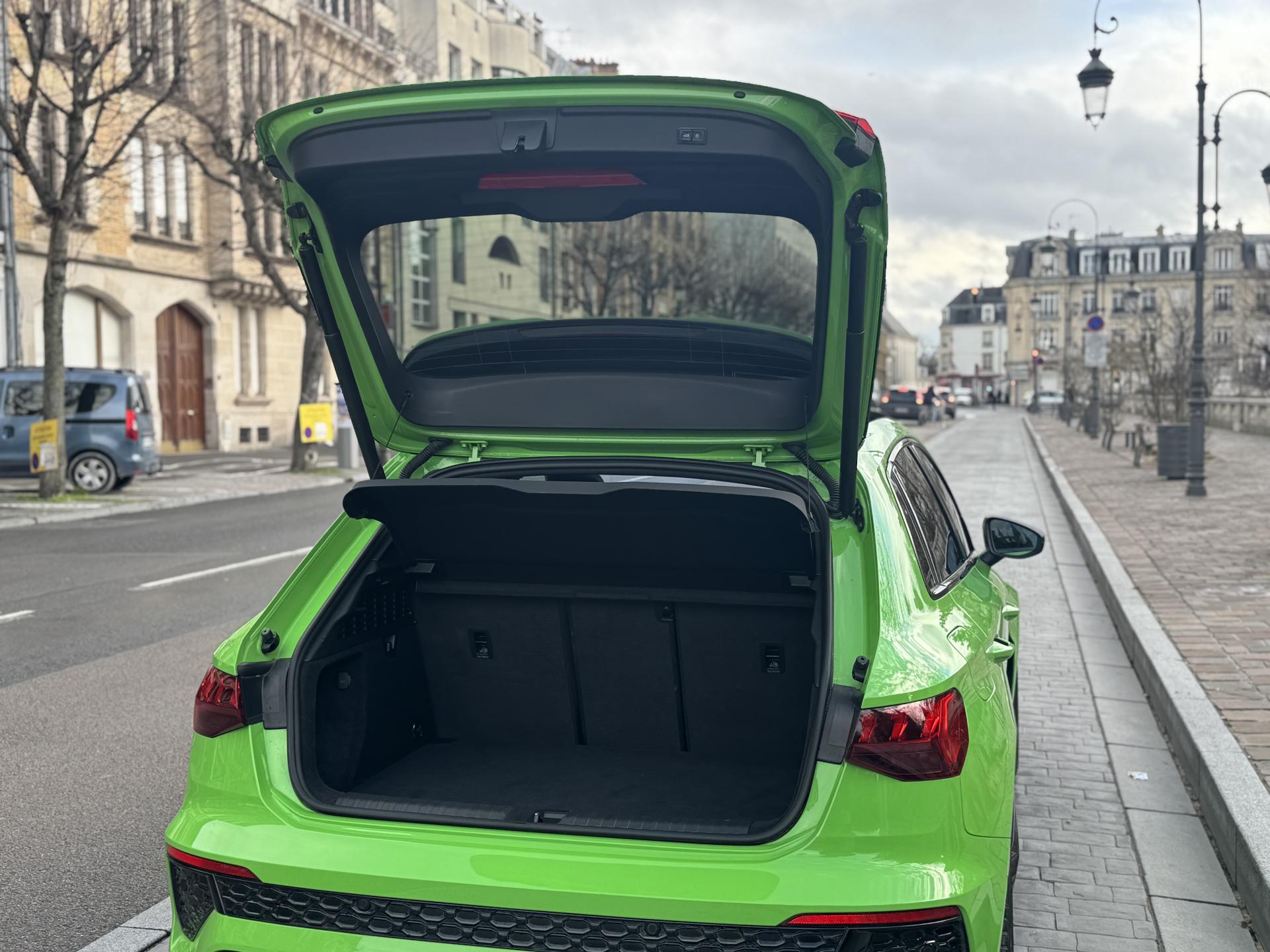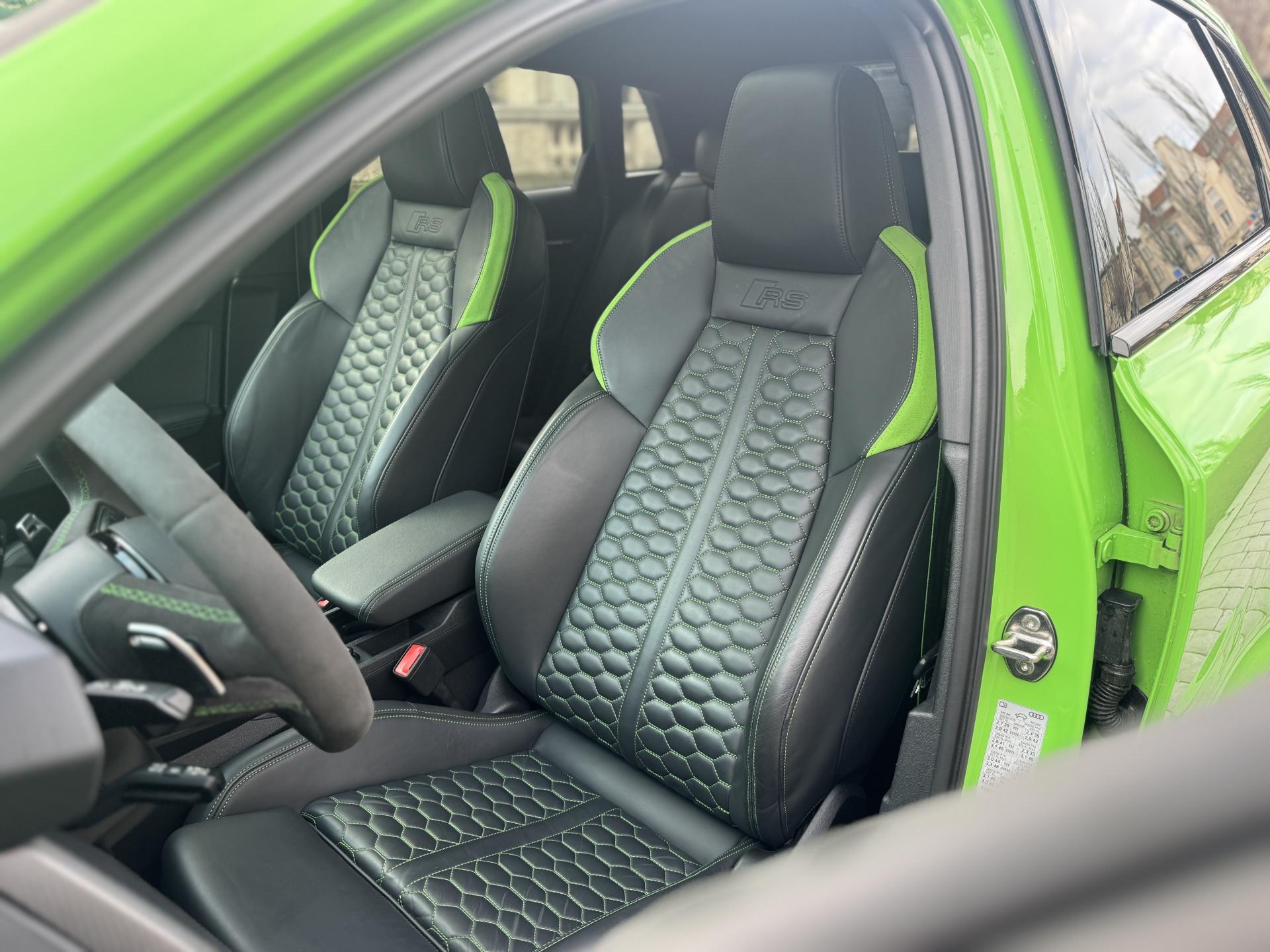 Les jantes 19 pouces en noir brillant, les phares Audi Matrix LED, les spoilers avant et arrière, ainsi que la peinture exclusive Kyalami Green composent une présentation spectaculaire qui ne laisse personne indifférent.