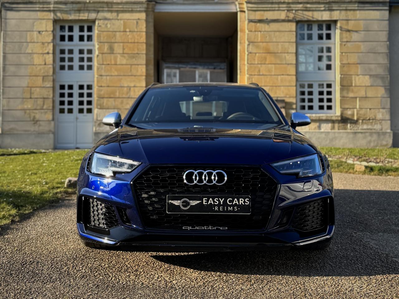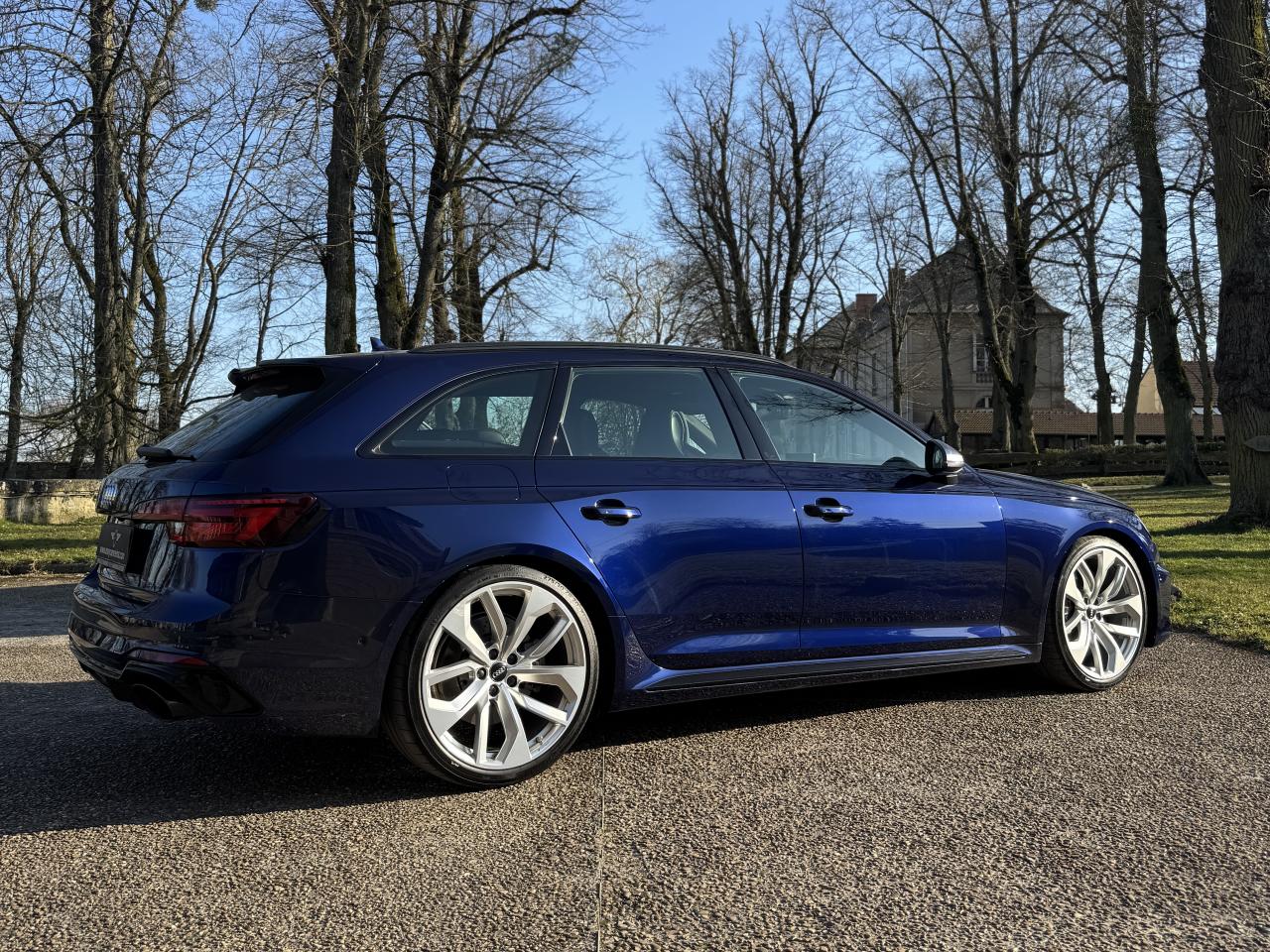 Côté style, cette RS4 ne passe pas inaperçue. Son Bleu Navarra métallisé sublime ses lignes agressives, tandis que ses jantes alliage RS, ses élargisseurs d’ailes prononcés et ses sorties d’échappement ovales rappellent qu’elle est prête à rugir à tout moment.