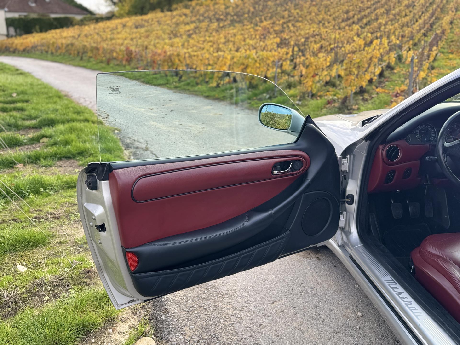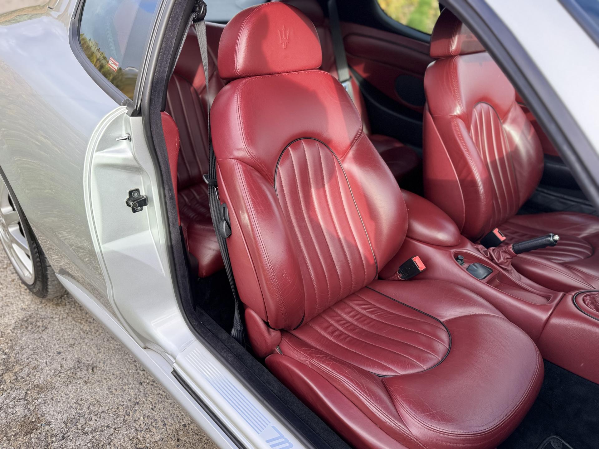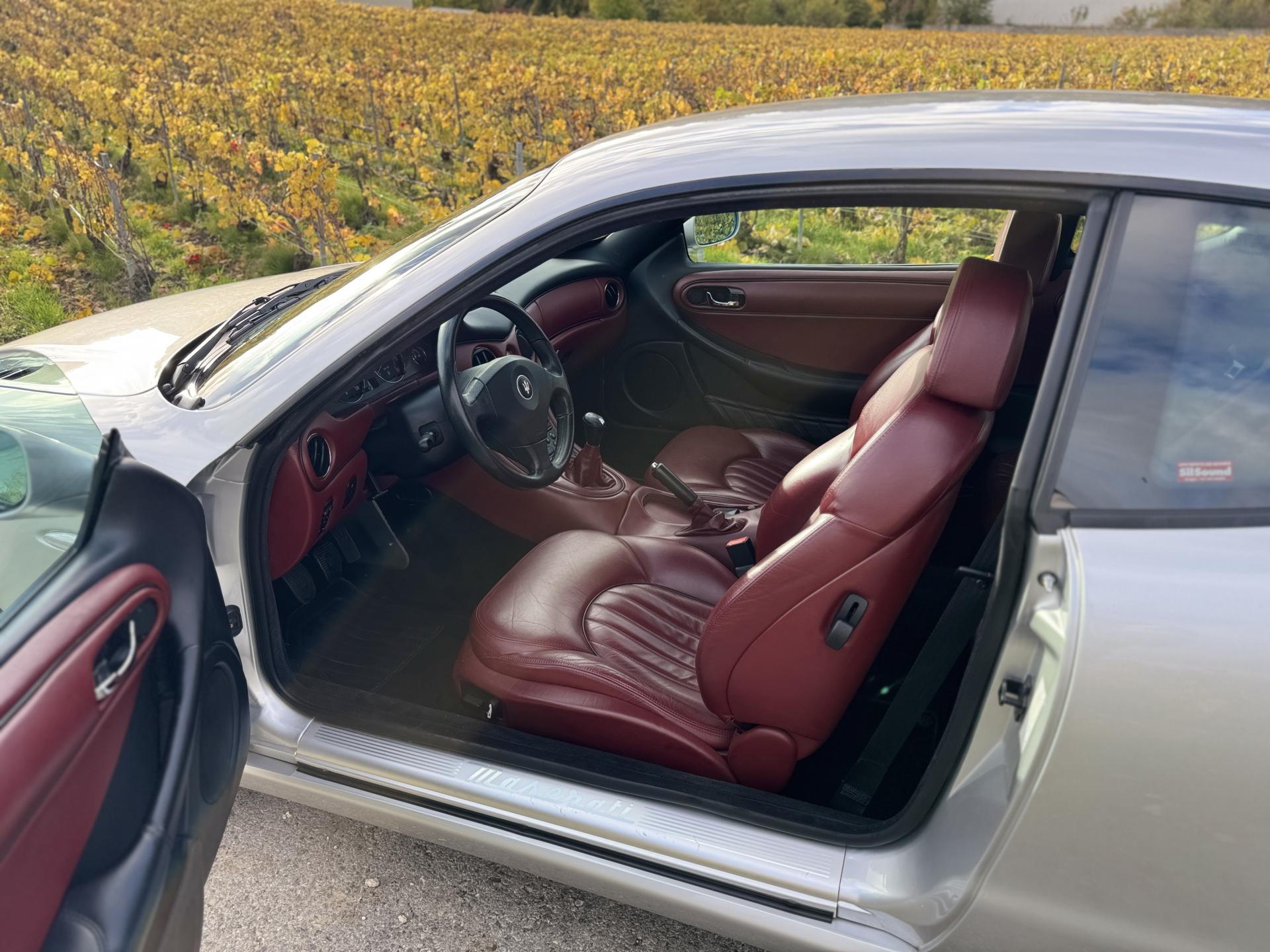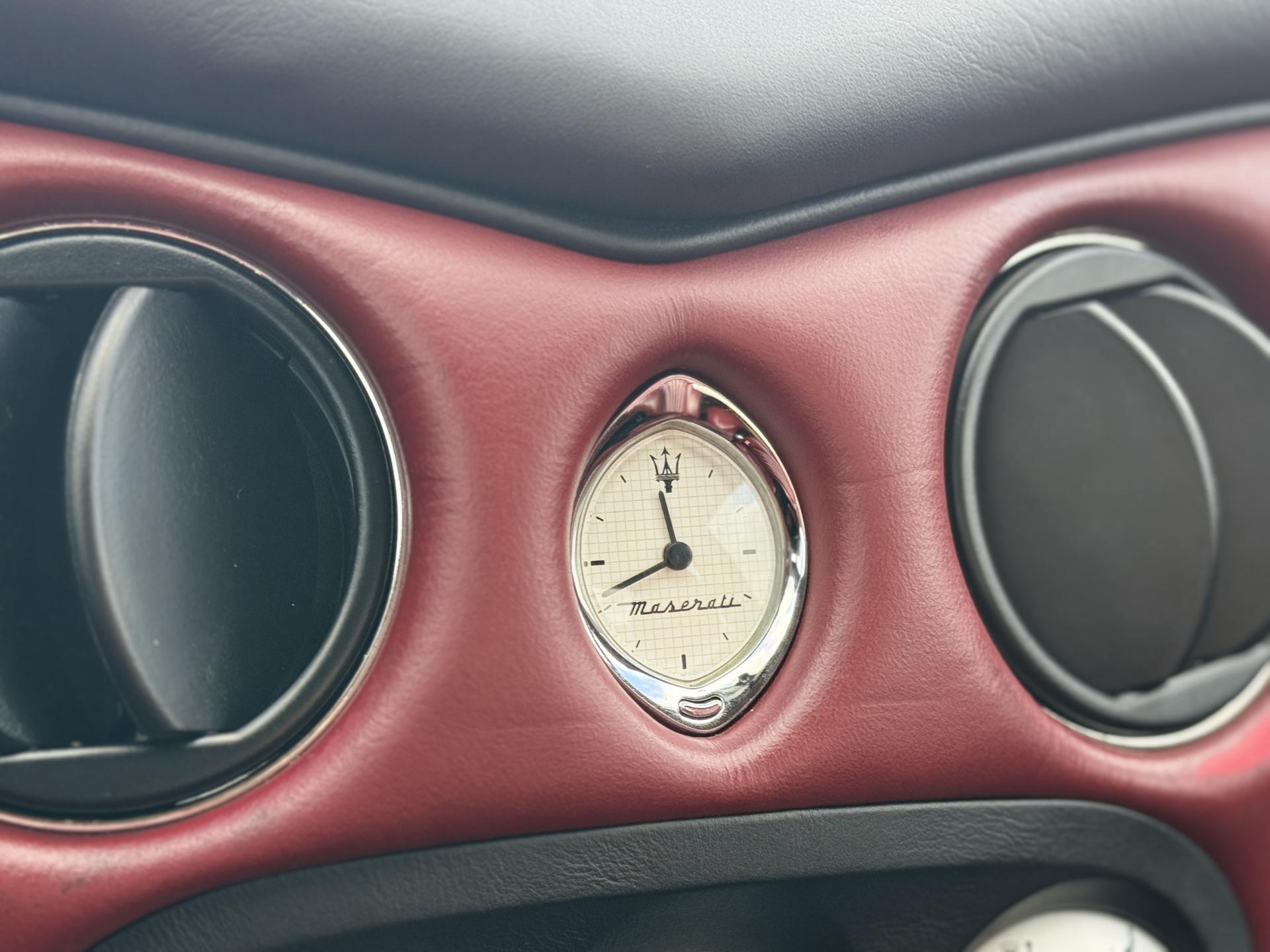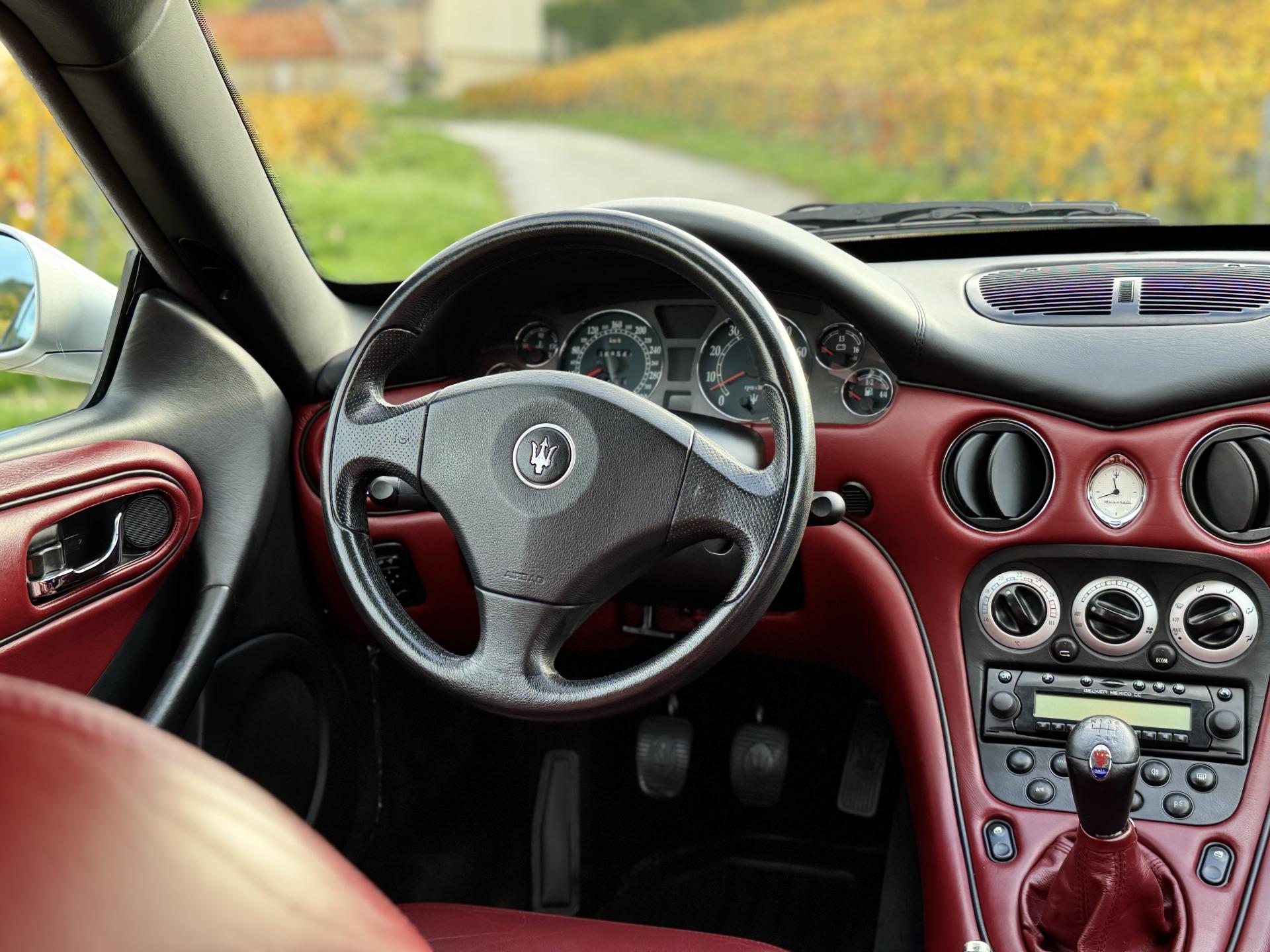L’habitacle, typiquement Maserati, marie cuir souple, horloge centrale et détails raffinés. Les sièges électriques, la direction assistée variable, la fermeture centralisée, les vitres et rétroviseurs électriques, ainsi que les jantes alliage participent à une expérience aussi élégante que confortable.