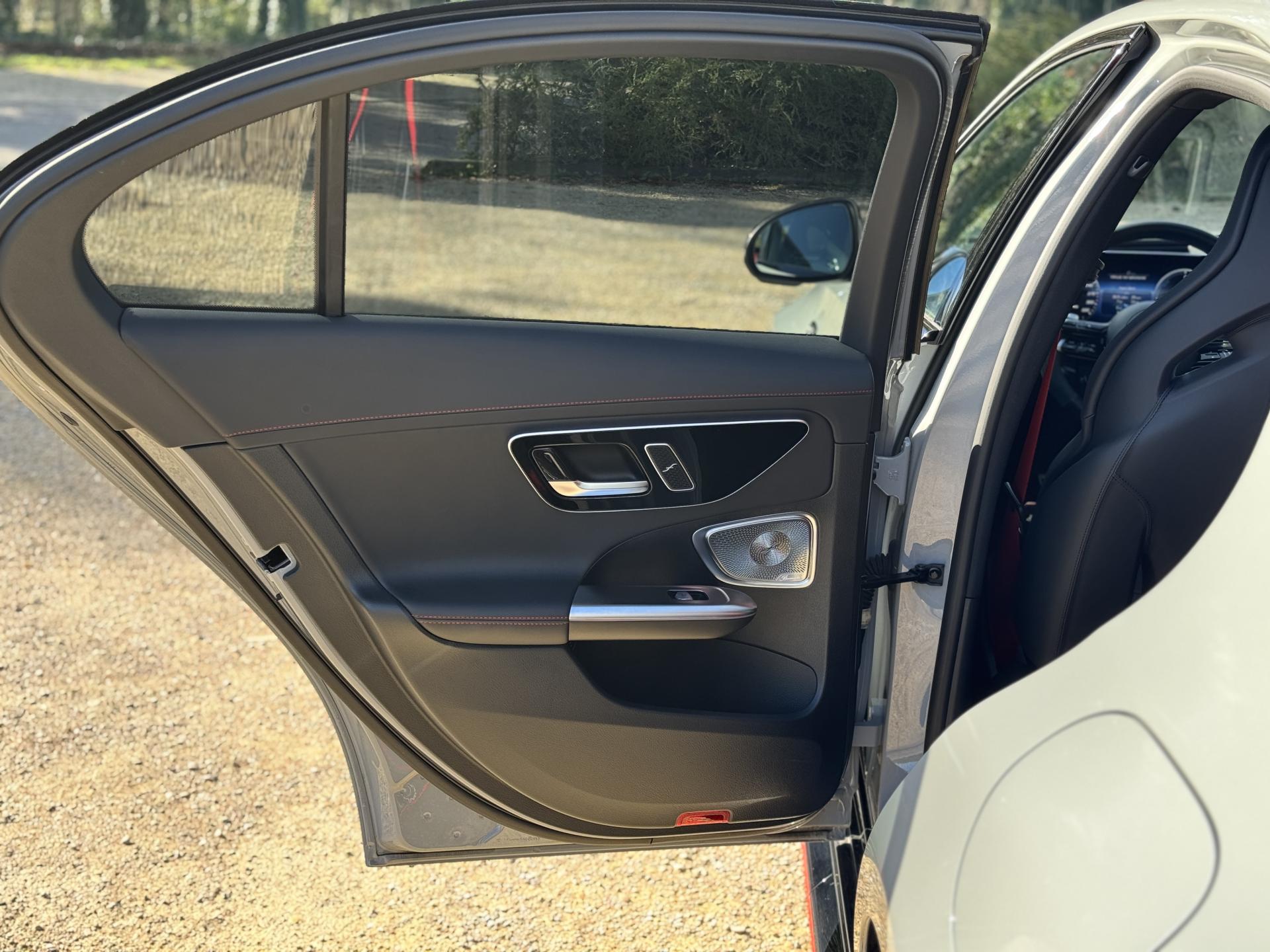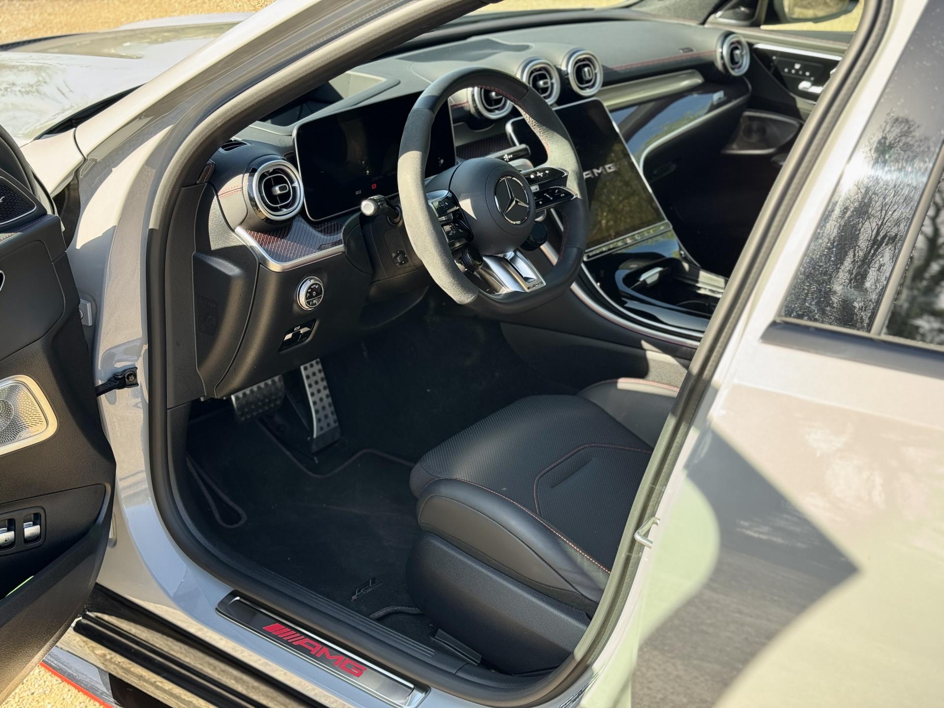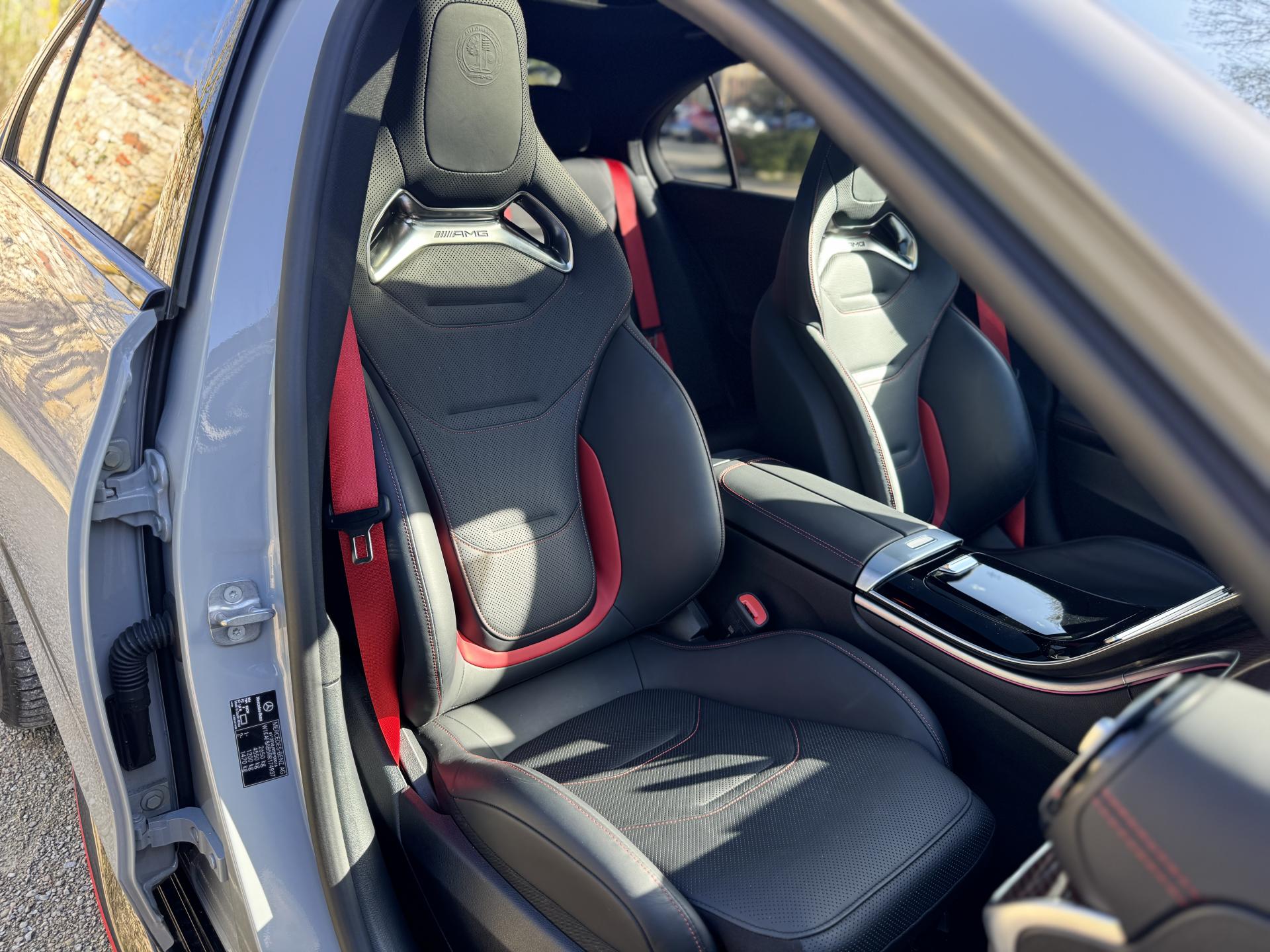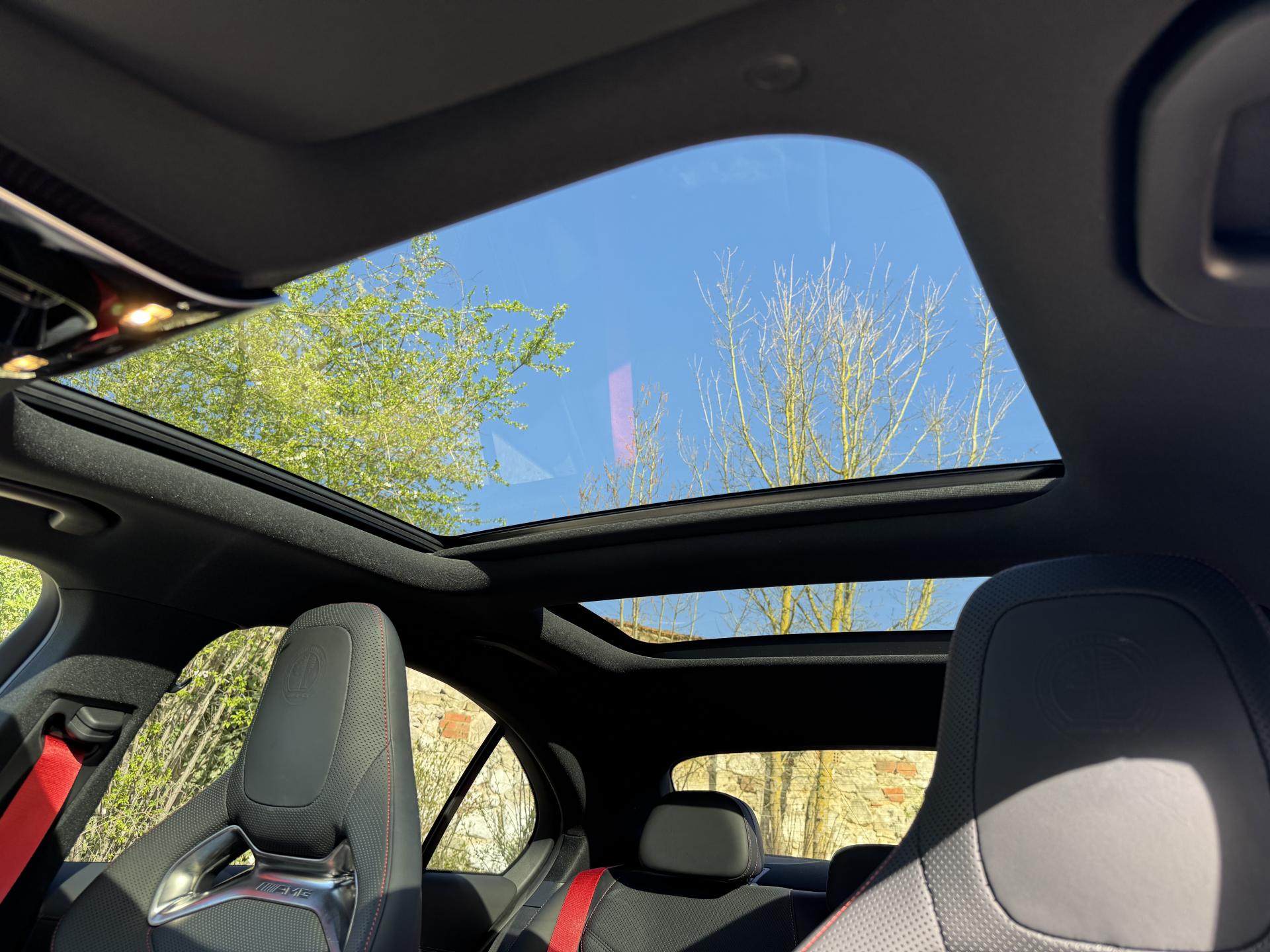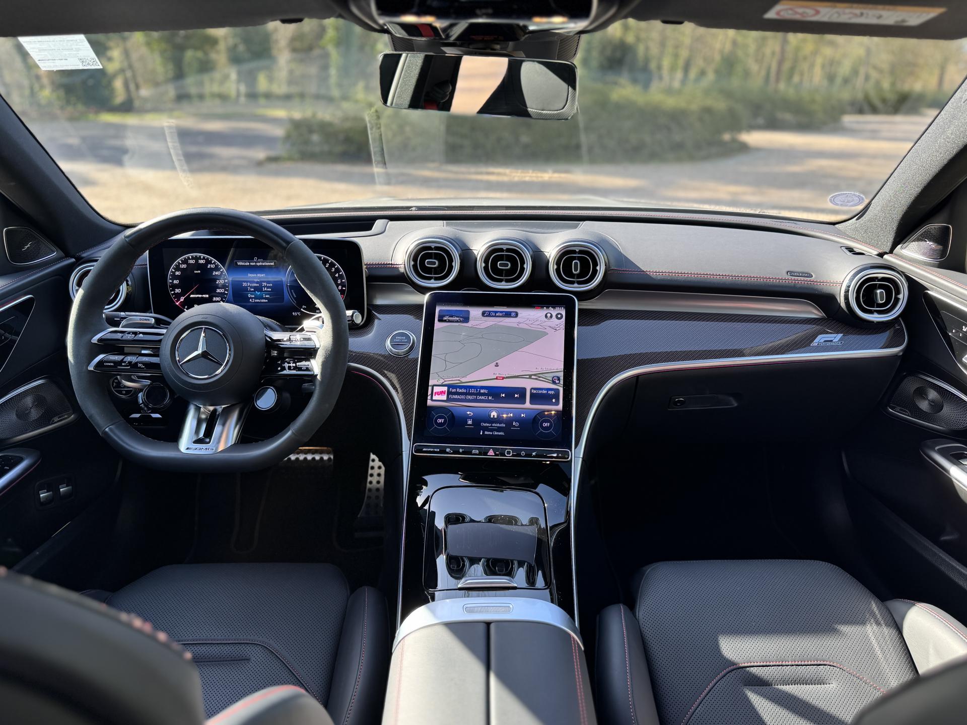 L'habitacle en cuir noir et rouge respire le raffinement sportif. Les sièges sport AMG avec coutures spécifiques offrent un maintien parfait. L'écran conducteur LCD de 31,2 cm, le système MBUX avec navigation Premium et l'affichage tête haute composent un environnement technologique de pointe. Le toit ouvrant panoramique électrique et les touches AMG Drive Unit sur le volant complètent l'ensemble.