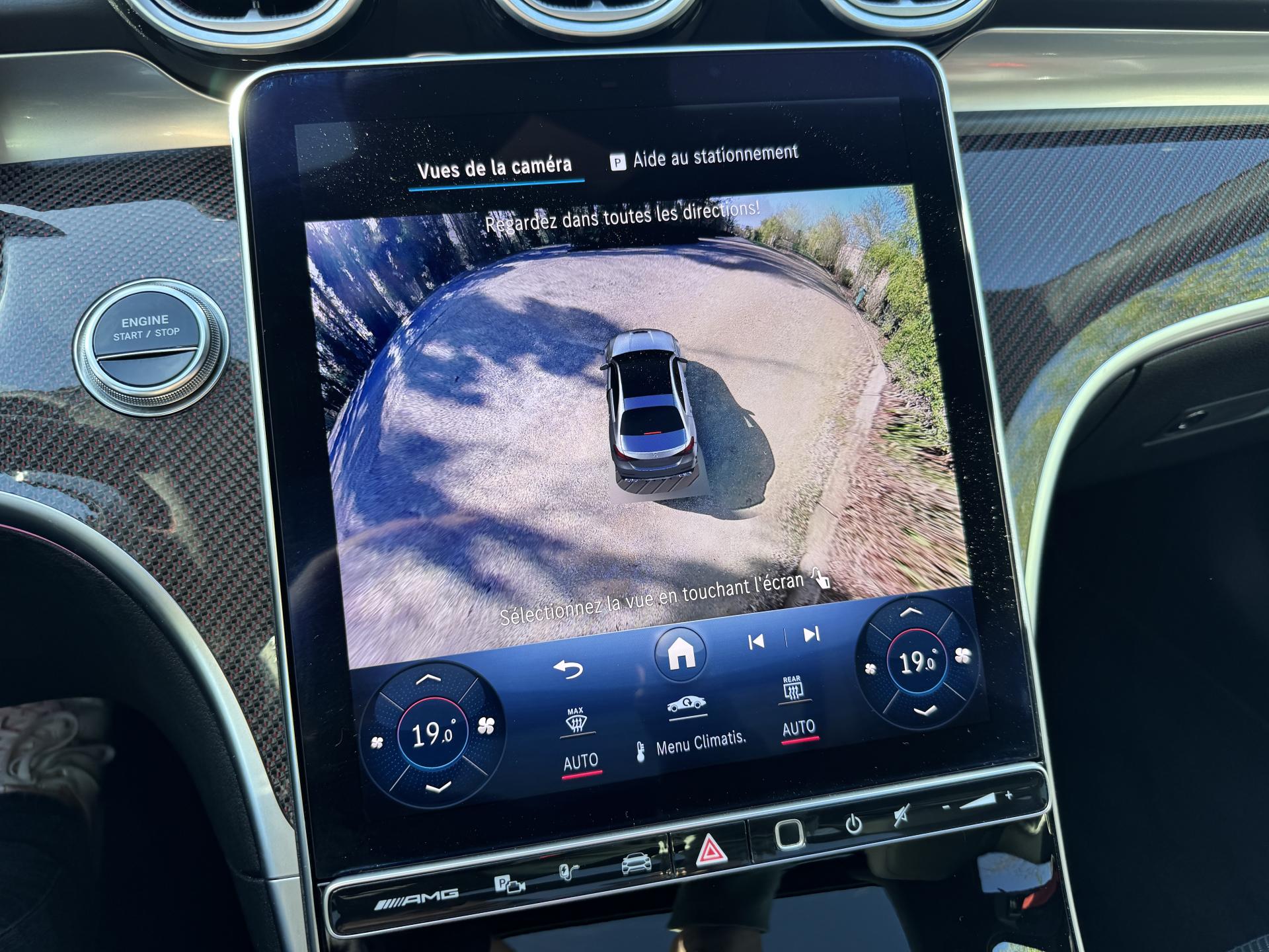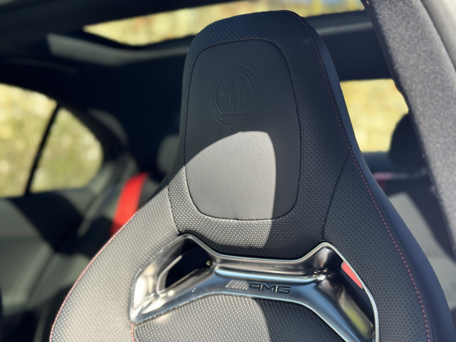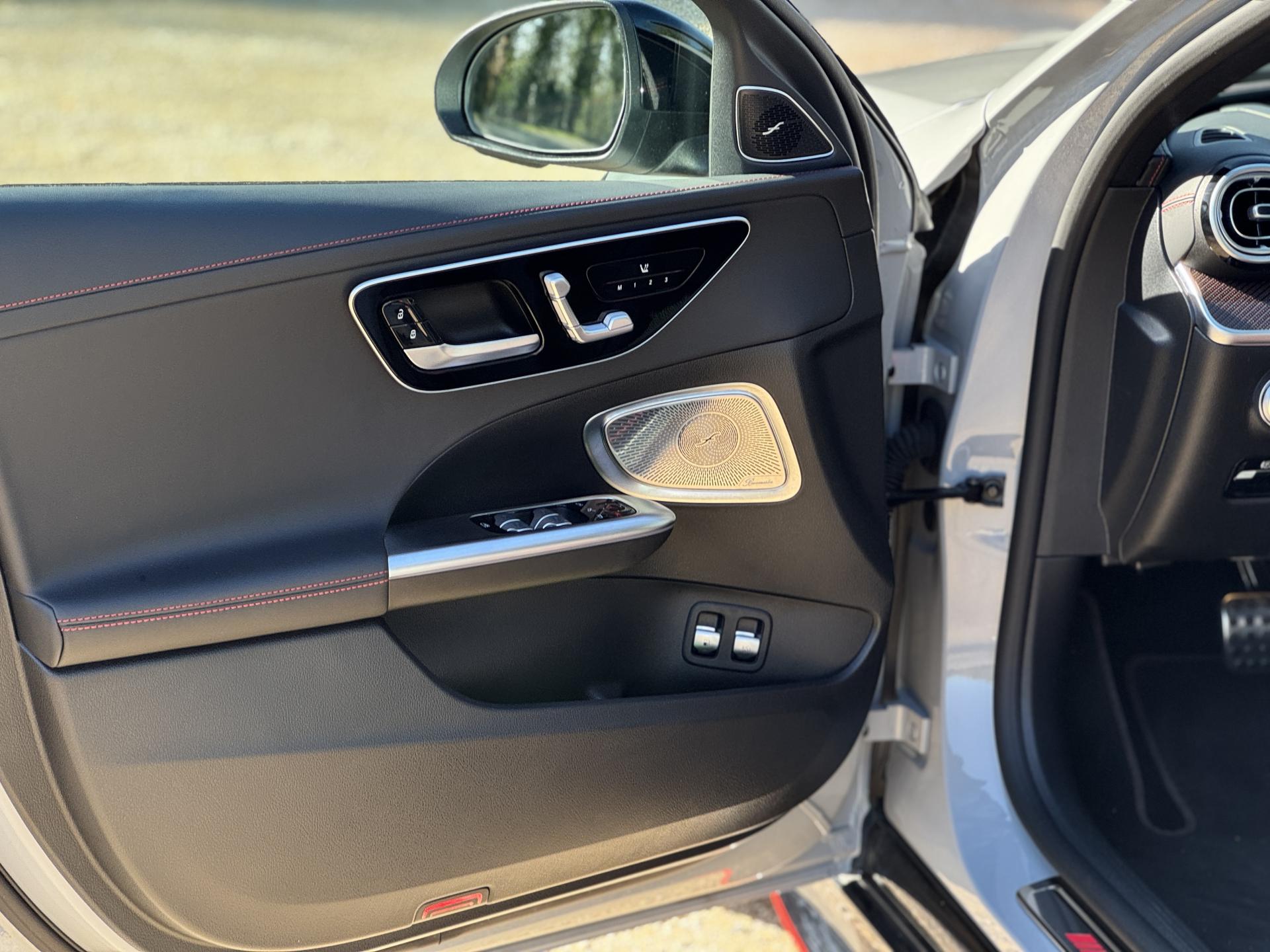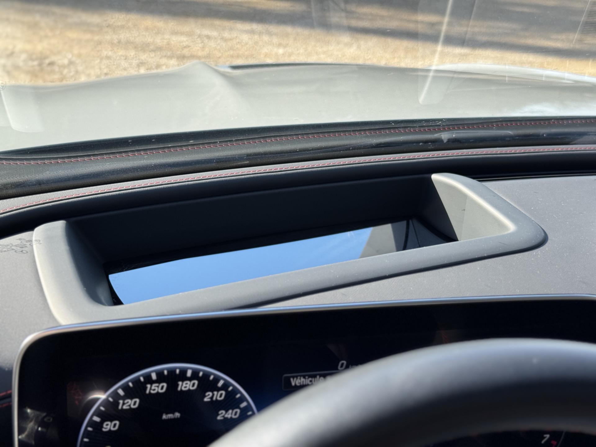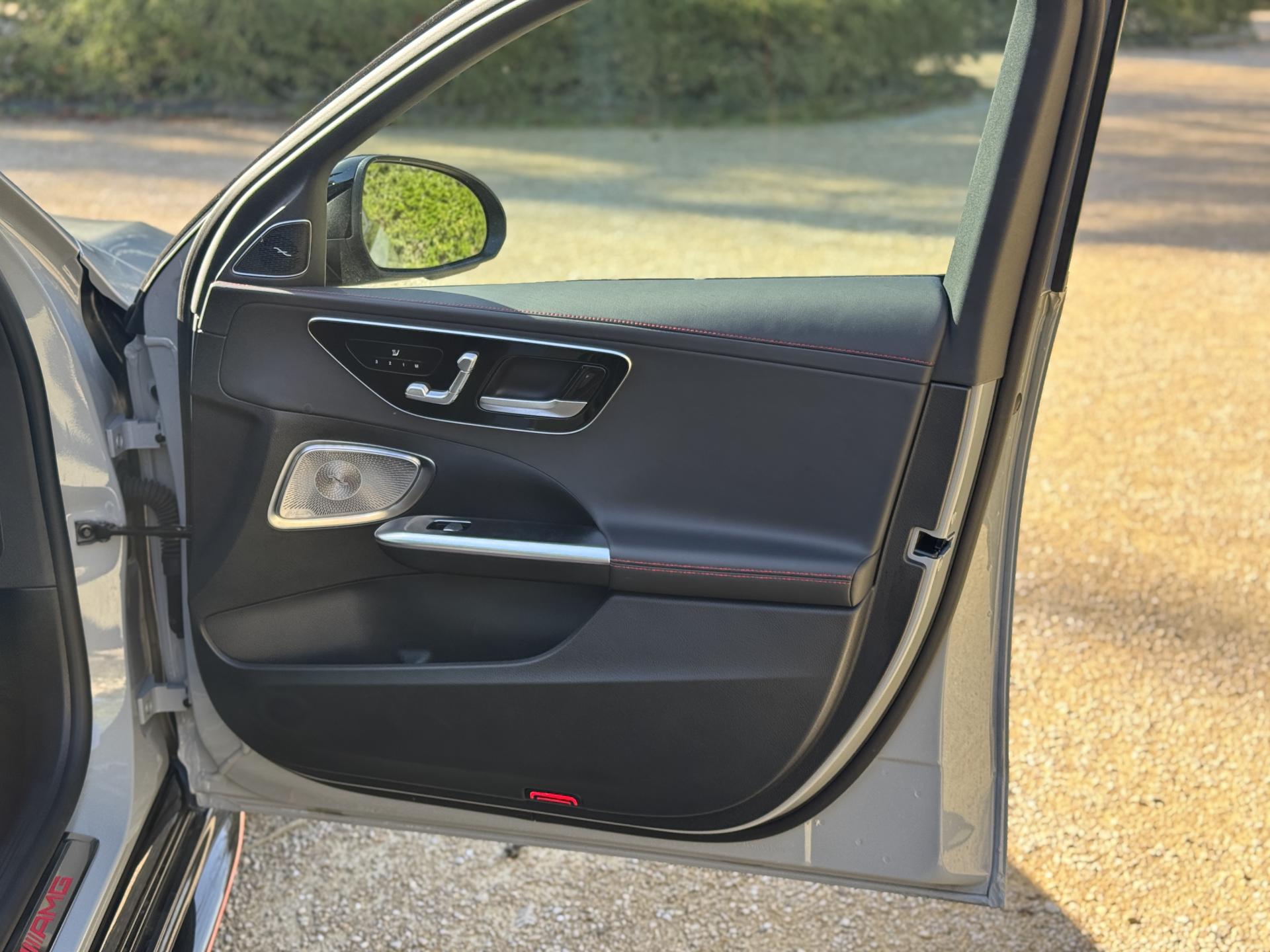 L'habitacle en cuir noir et rouge respire le raffinement sportif. Les sièges sport AMG avec coutures spécifiques offrent un maintien parfait. L'écran conducteur LCD de 31,2 cm, le système MBUX avec navigation Premium et l'affichage tête haute composent un environnement technologique de pointe. Le toit ouvrant panoramique électrique et les touches AMG Drive Unit sur le volant complètent l'ensemble.