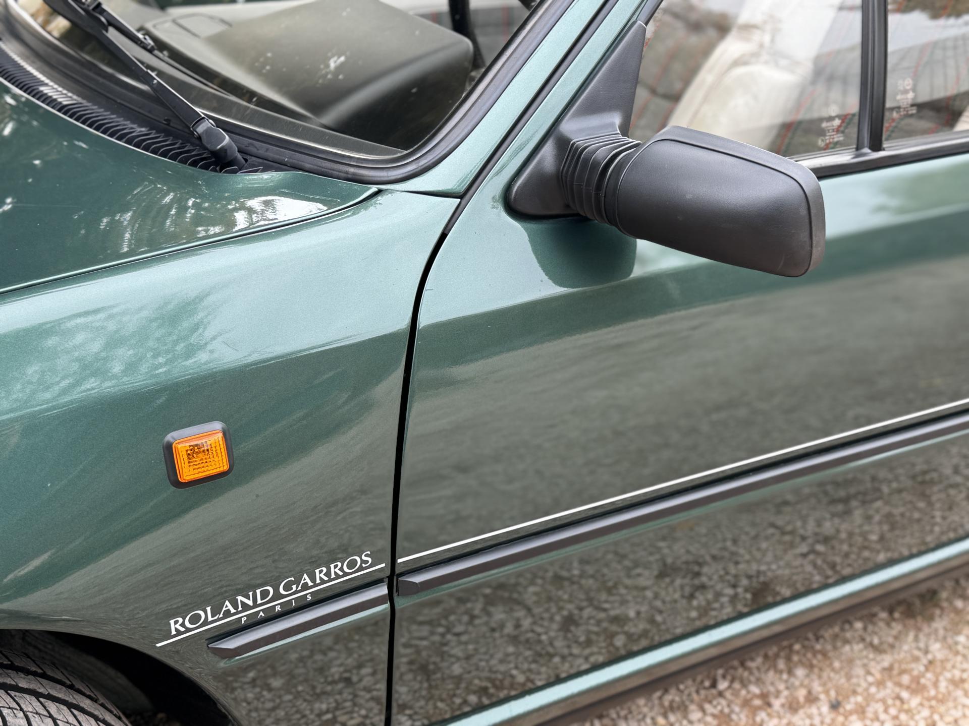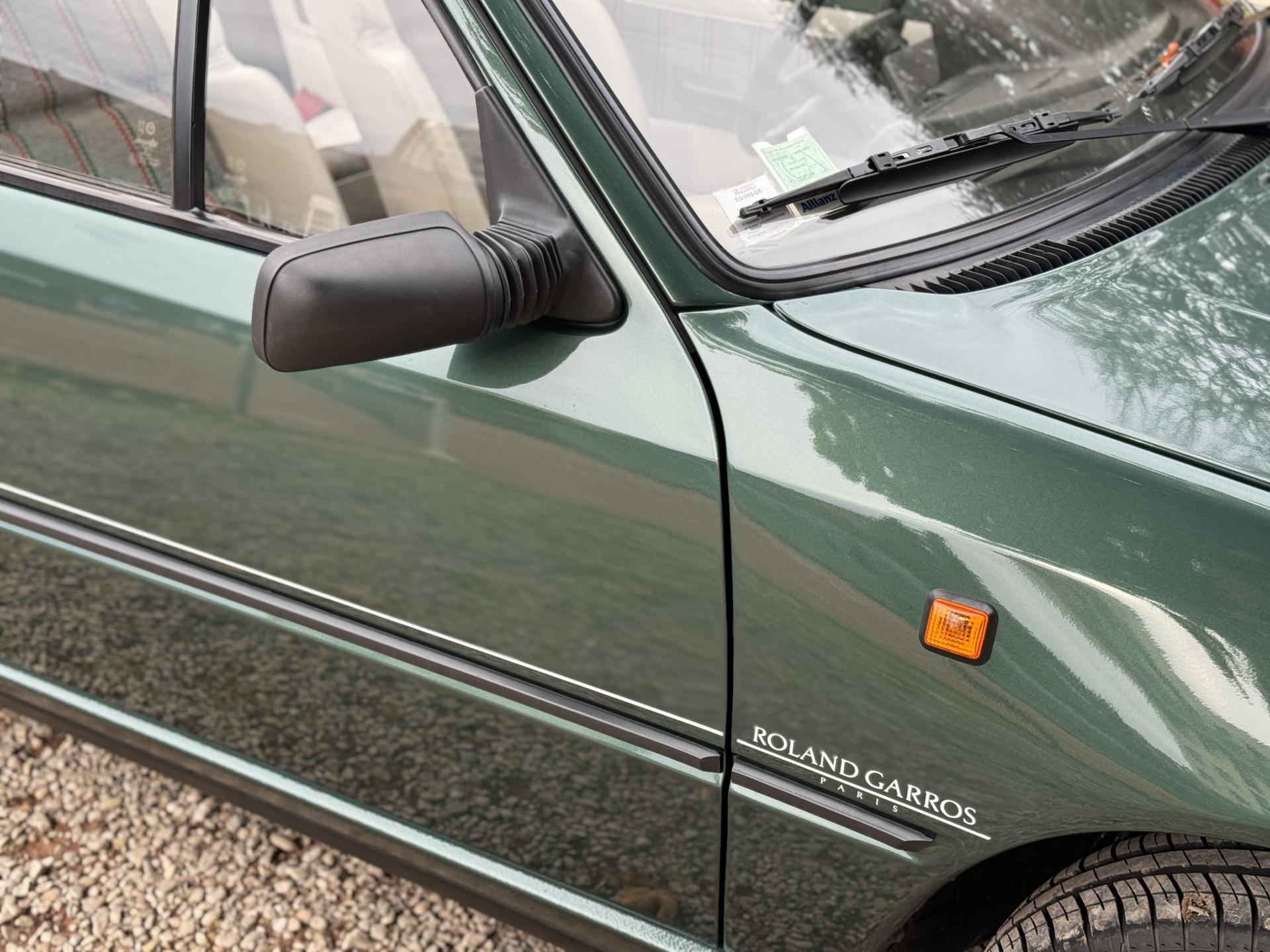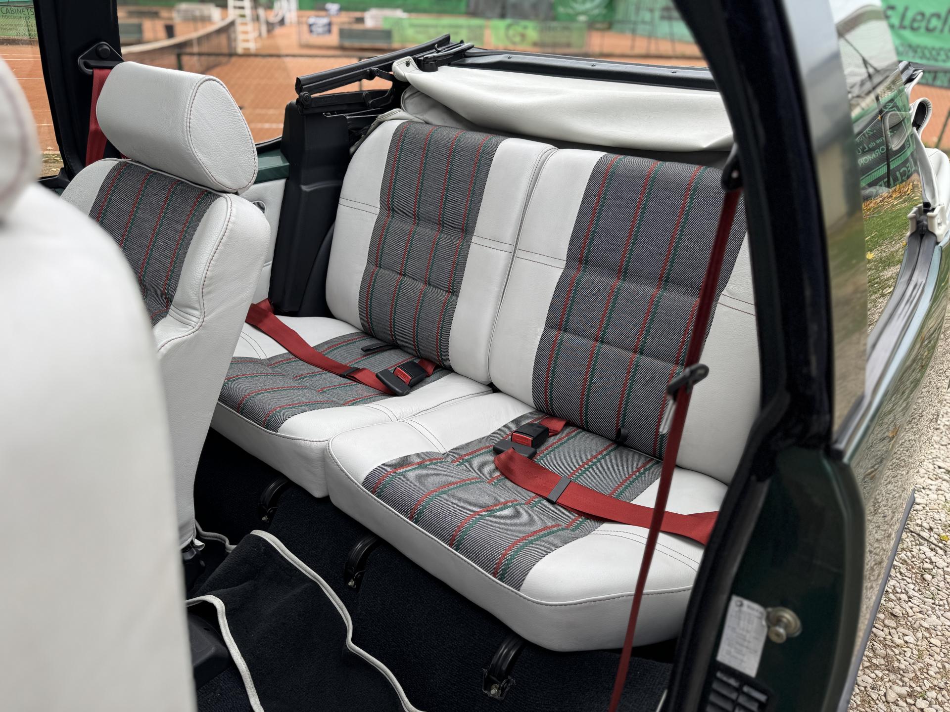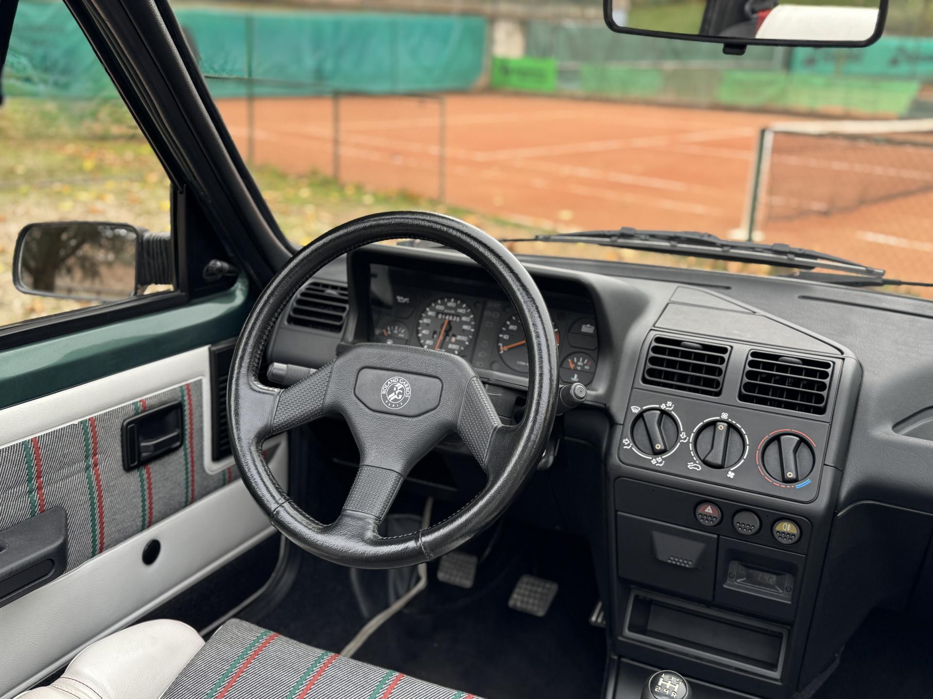 L’intérieur, parfaitement conservé, met en valeur le soin apporté à cette série : sièges et appuis-têtes en cuir blanc, ceintures rouge brique, volant sport gainé de cuir, surtapis anthracite gansés de blanc et logos Roland Garros sur le volant et la carrosserie. Les jantes alliage 13 pouces et les jupes couleur carrosserie complètent son allure raffinée et dynamique.