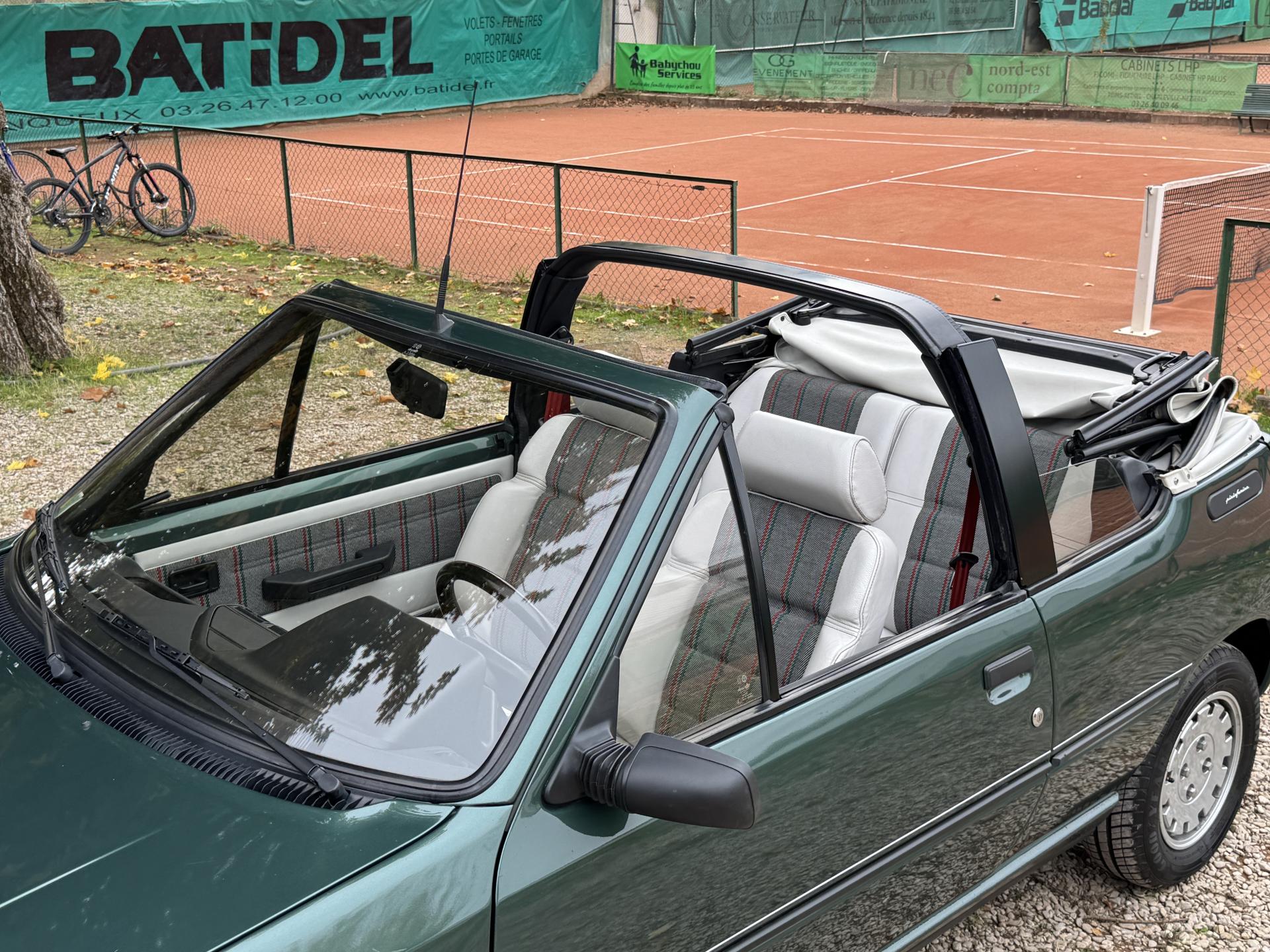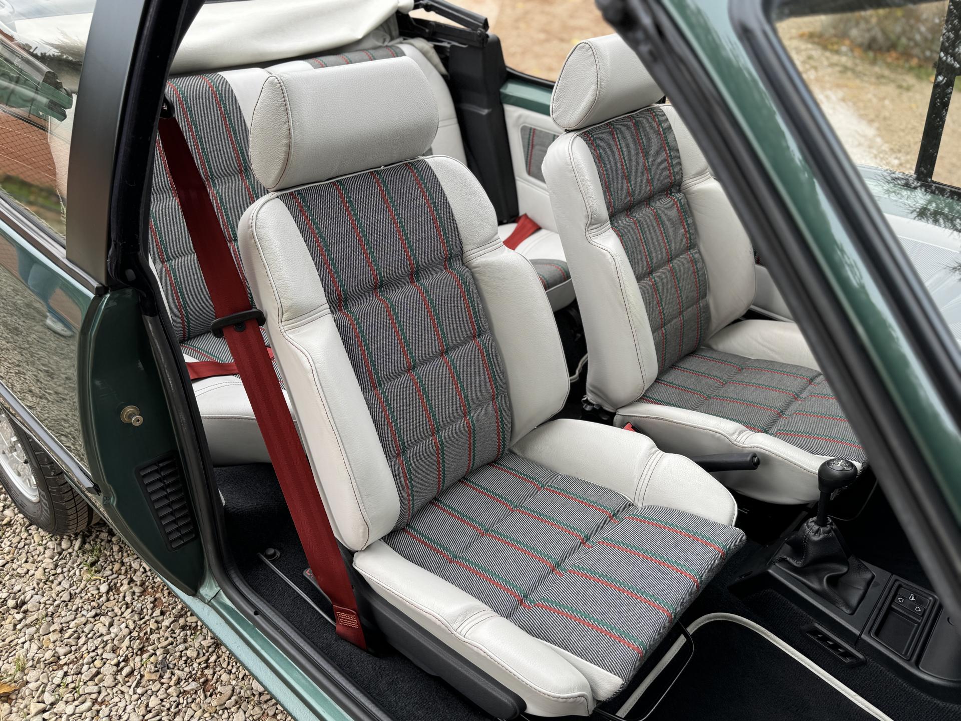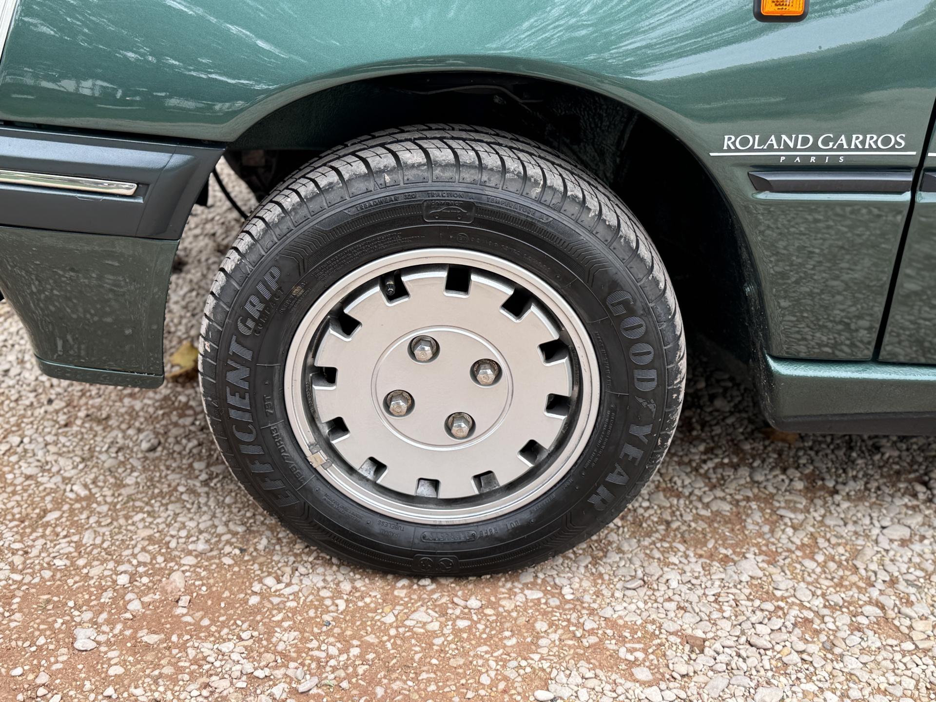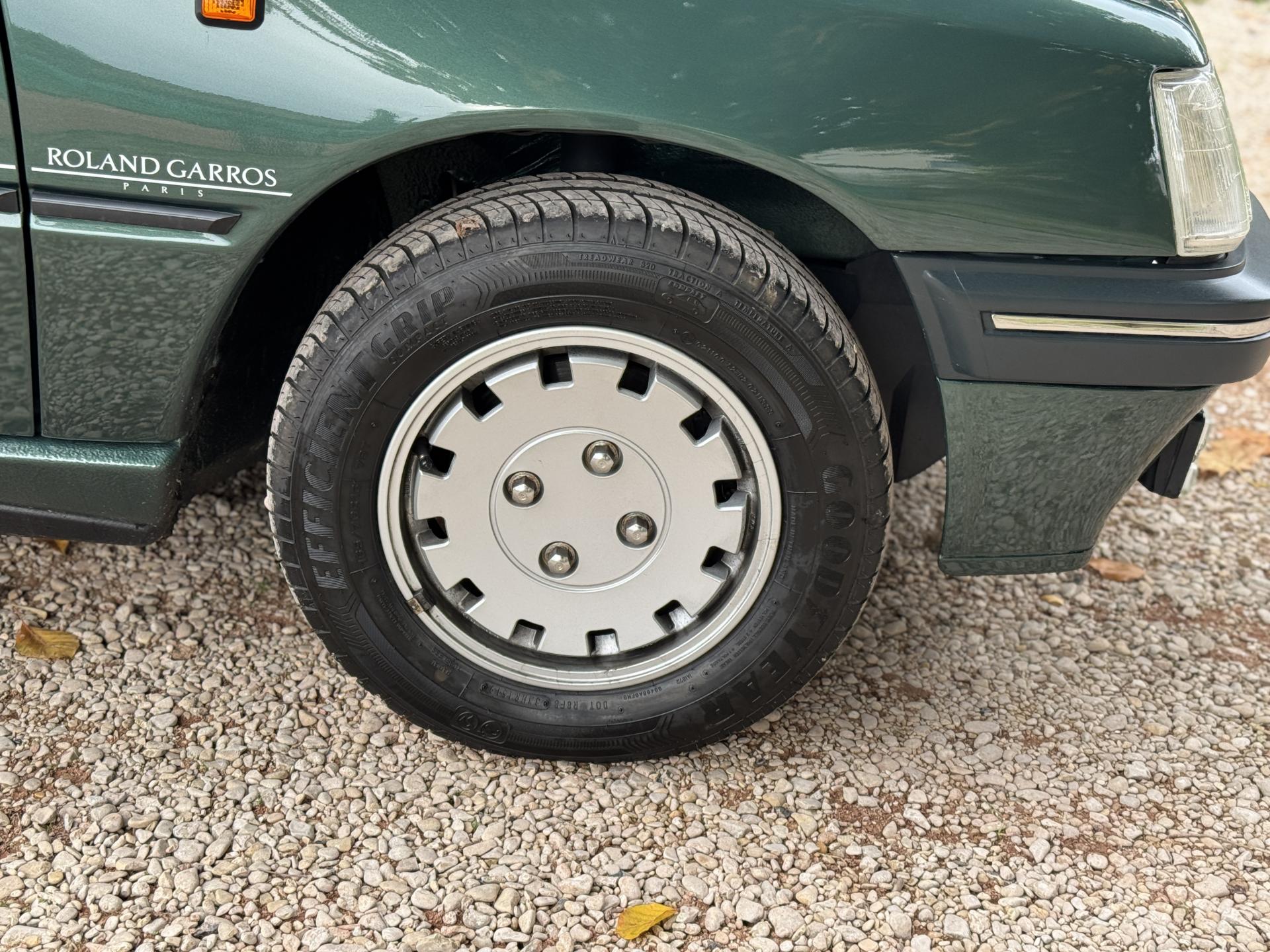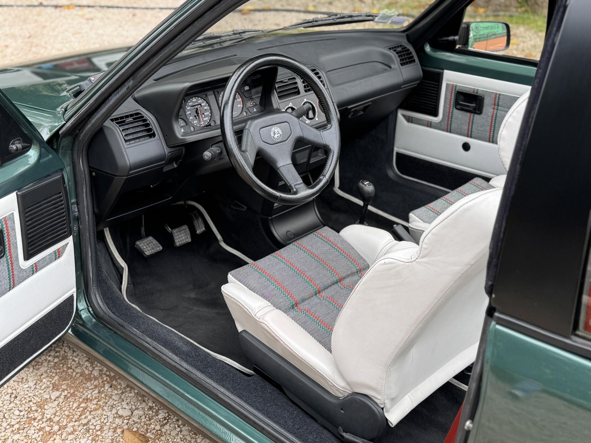 L’intérieur, parfaitement conservé, met en valeur le soin apporté à cette série : sièges et appuis-têtes en cuir blanc, ceintures rouge brique, volant sport gainé de cuir, surtapis anthracite gansés de blanc et logos Roland Garros sur le volant et la carrosserie. Les jantes alliage 13 pouces et les jupes couleur carrosserie complètent son allure raffinée et dynamique.