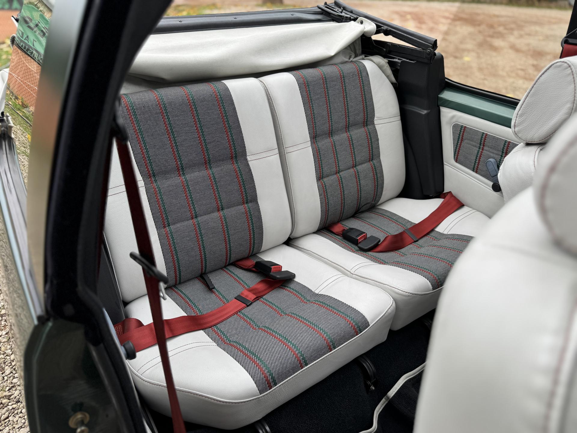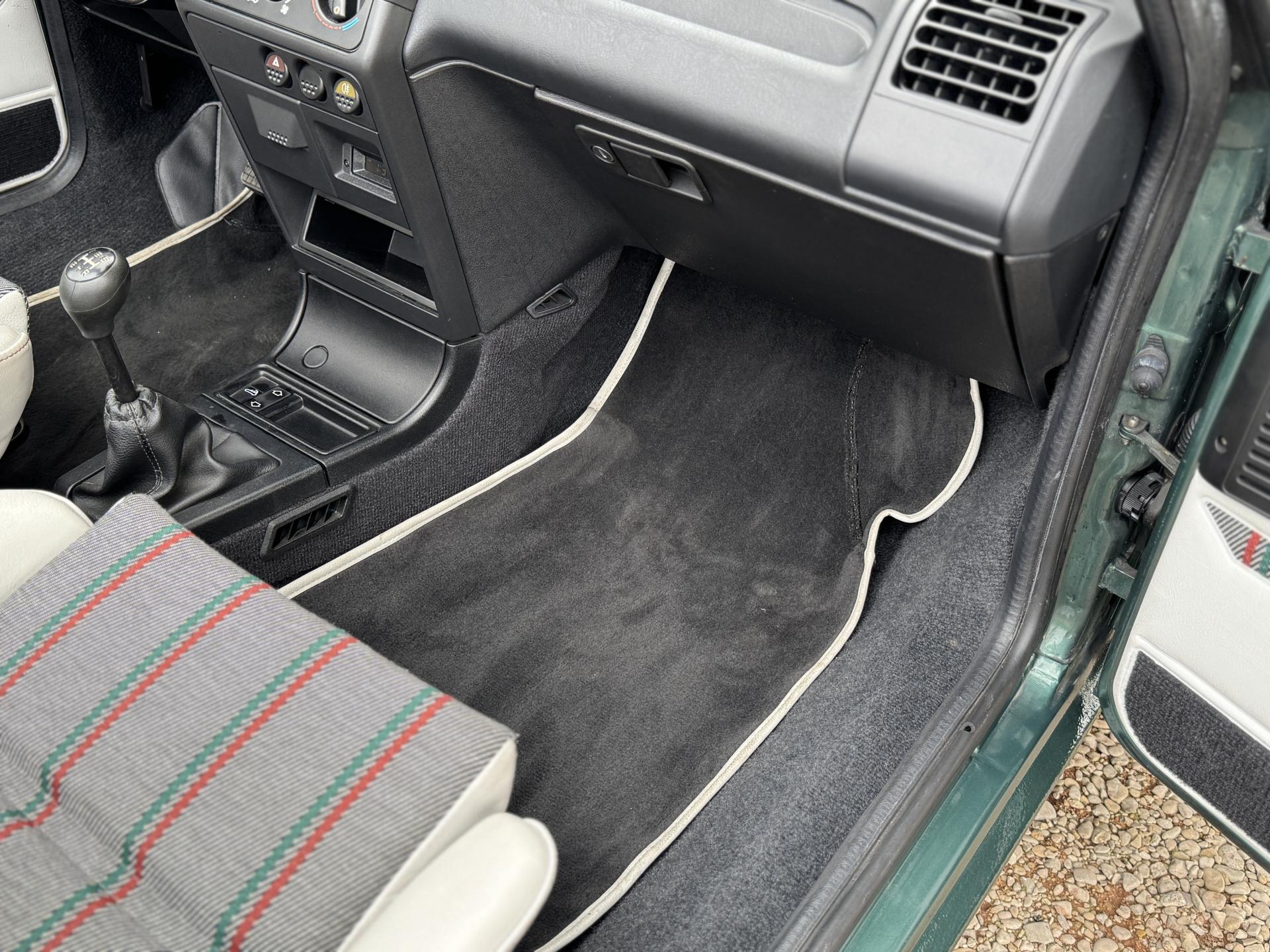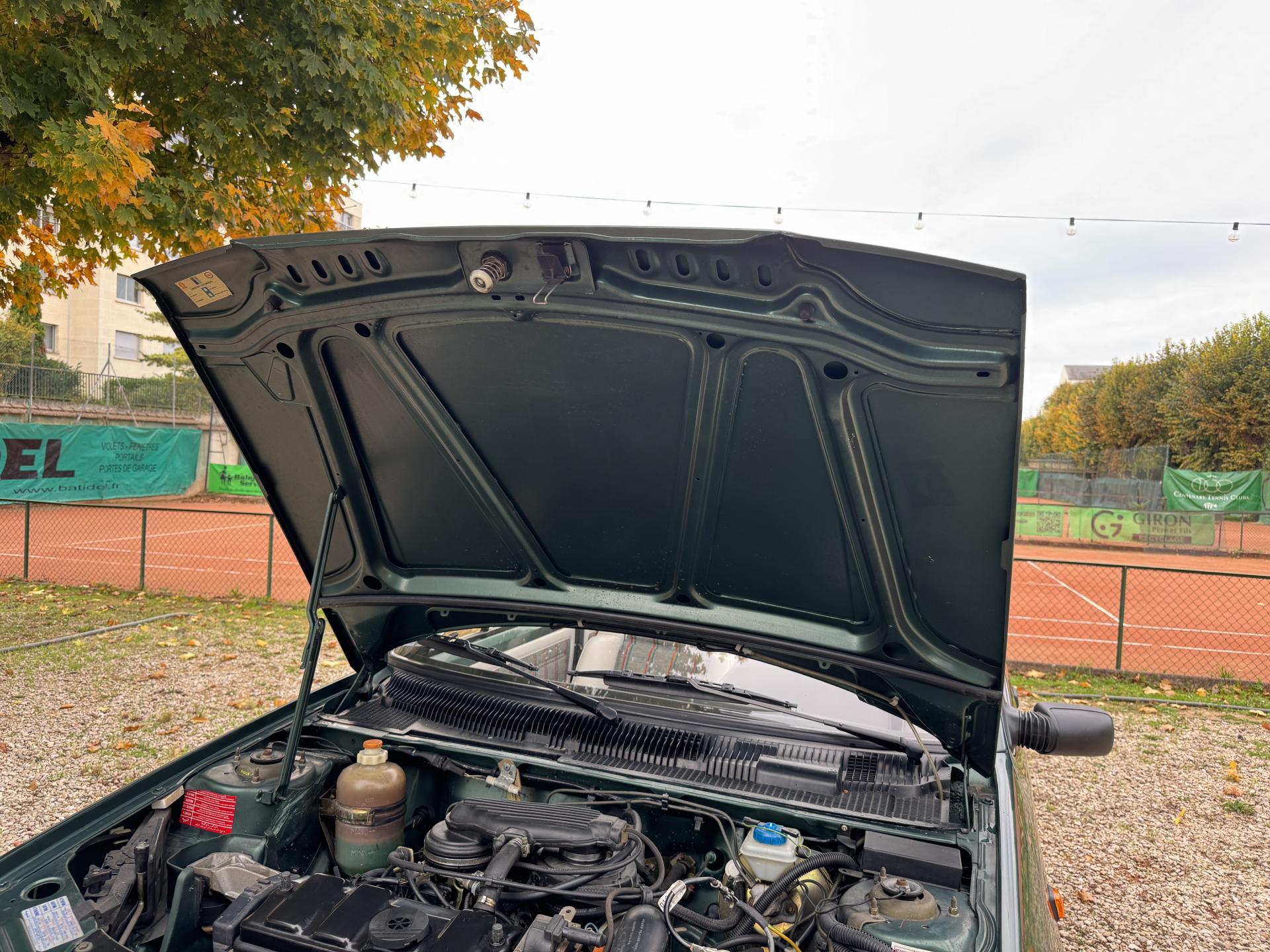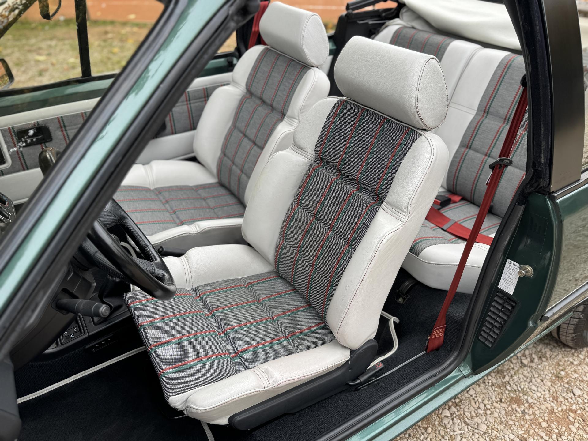 L’intérieur, parfaitement conservé, met en valeur le soin apporté à cette série : sièges et appuis-têtes en cuir blanc, ceintures rouge brique, volant sport gainé de cuir, surtapis anthracite gansés de blanc et logos Roland Garros sur le volant et la carrosserie. Les jantes alliage 13 pouces et les jupes couleur carrosserie complètent son allure raffinée et dynamique.