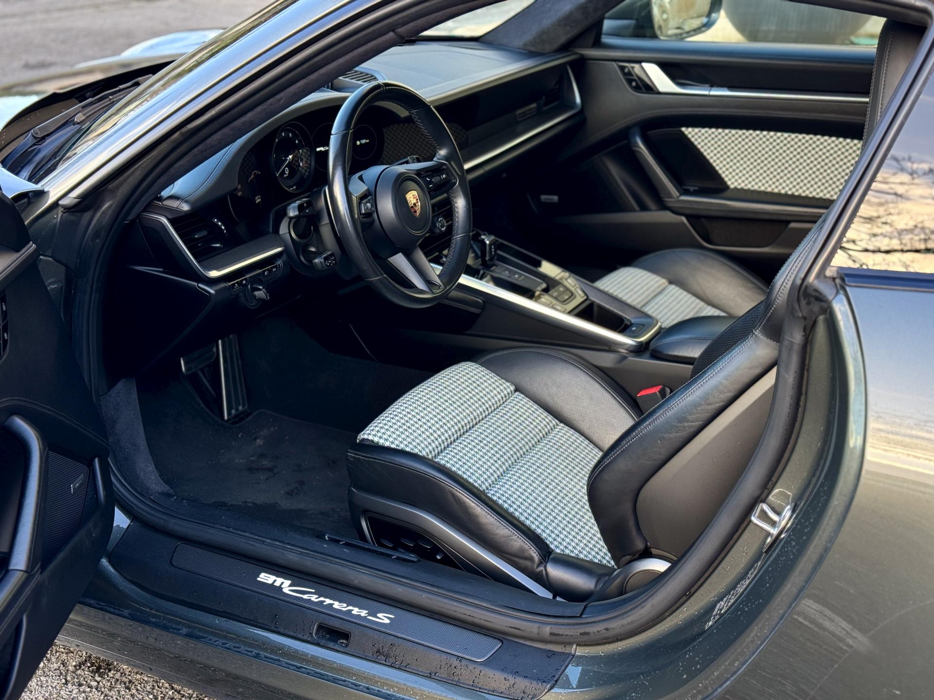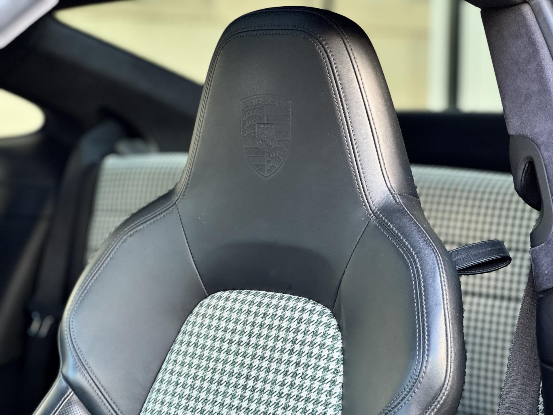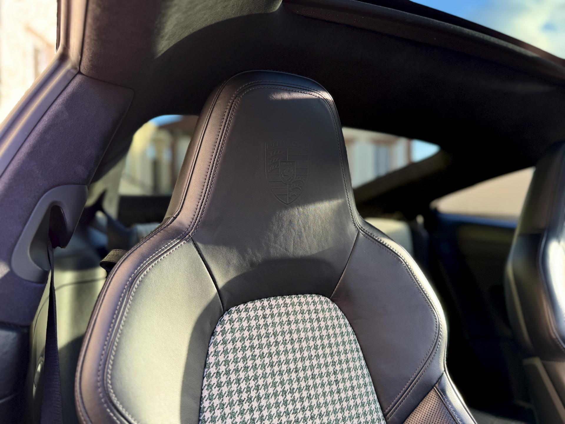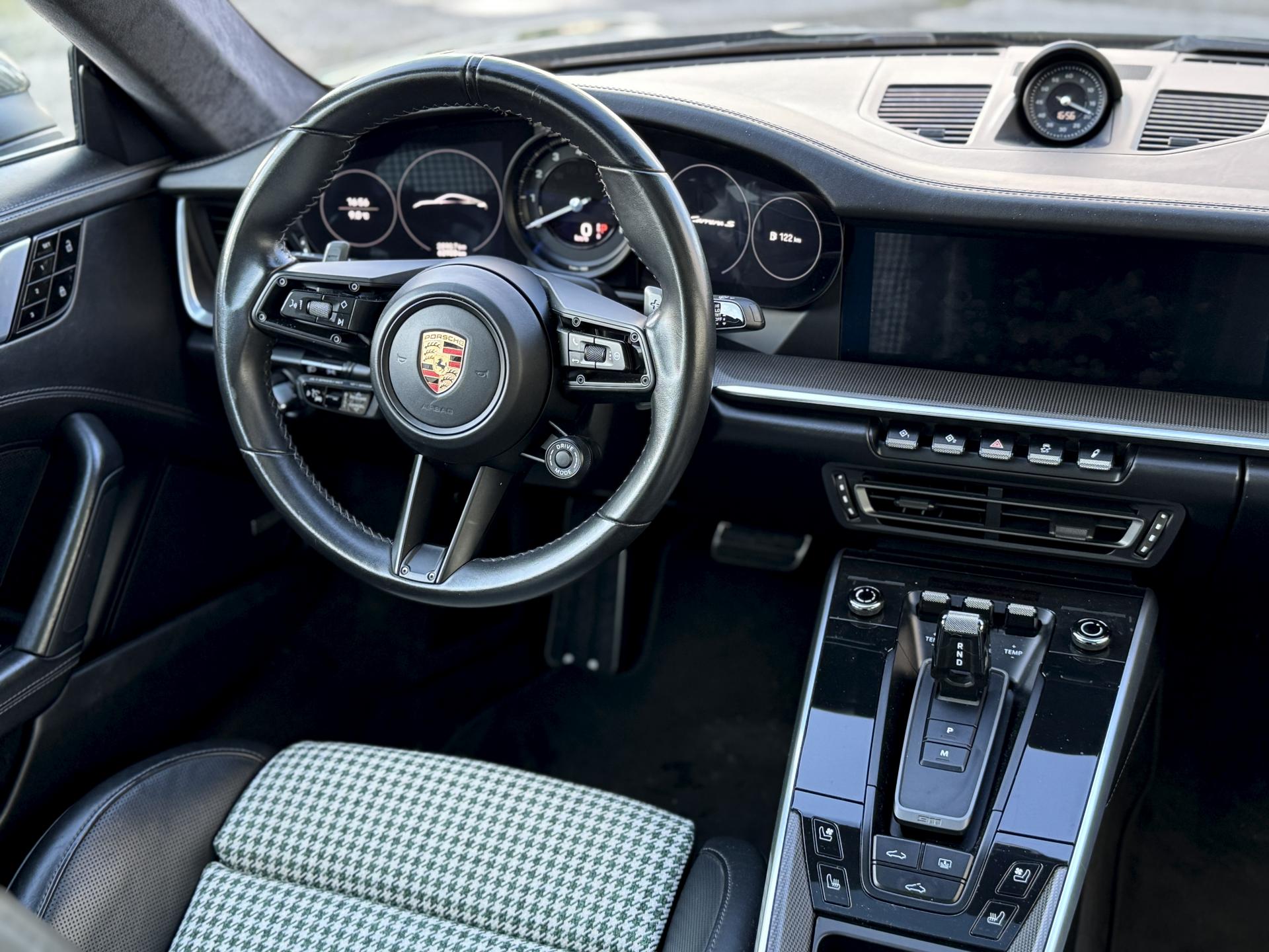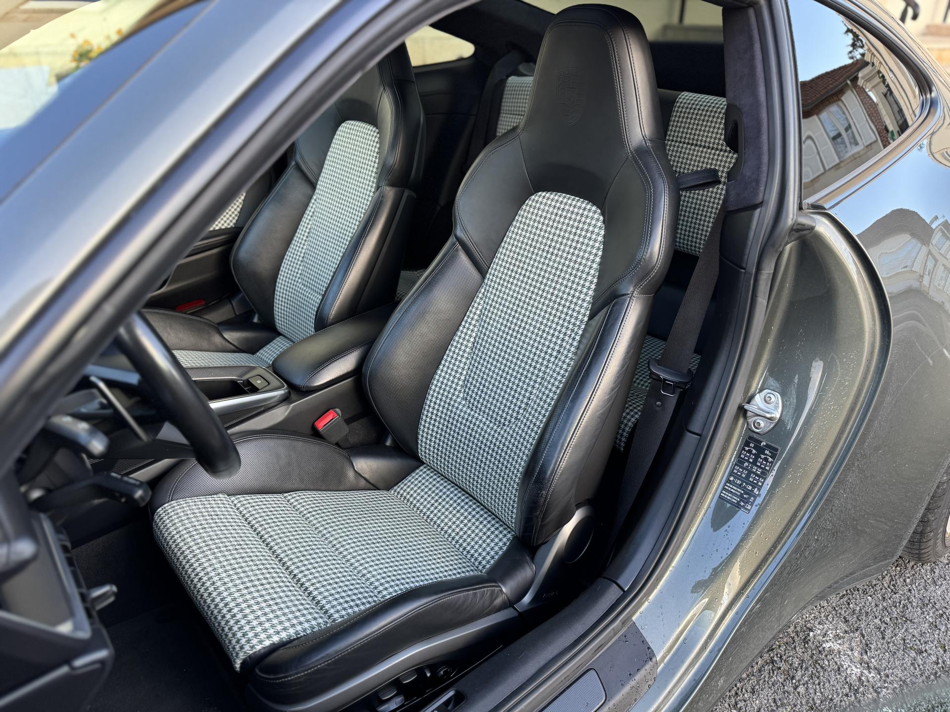 L'habitacle sur mesure en pied de poule vert est une véritable œuvre d'art qui rend hommage aux 911 légendaires. Les sièges sport électriques avec pack mémoire et cuir chauffant offrent un maintien parfait. Le volant sport multifonctions cuir chauffant, le ciel de pavillon en alcantara et le toit coulissant électrique en verre complètent une ambiance raffinée.