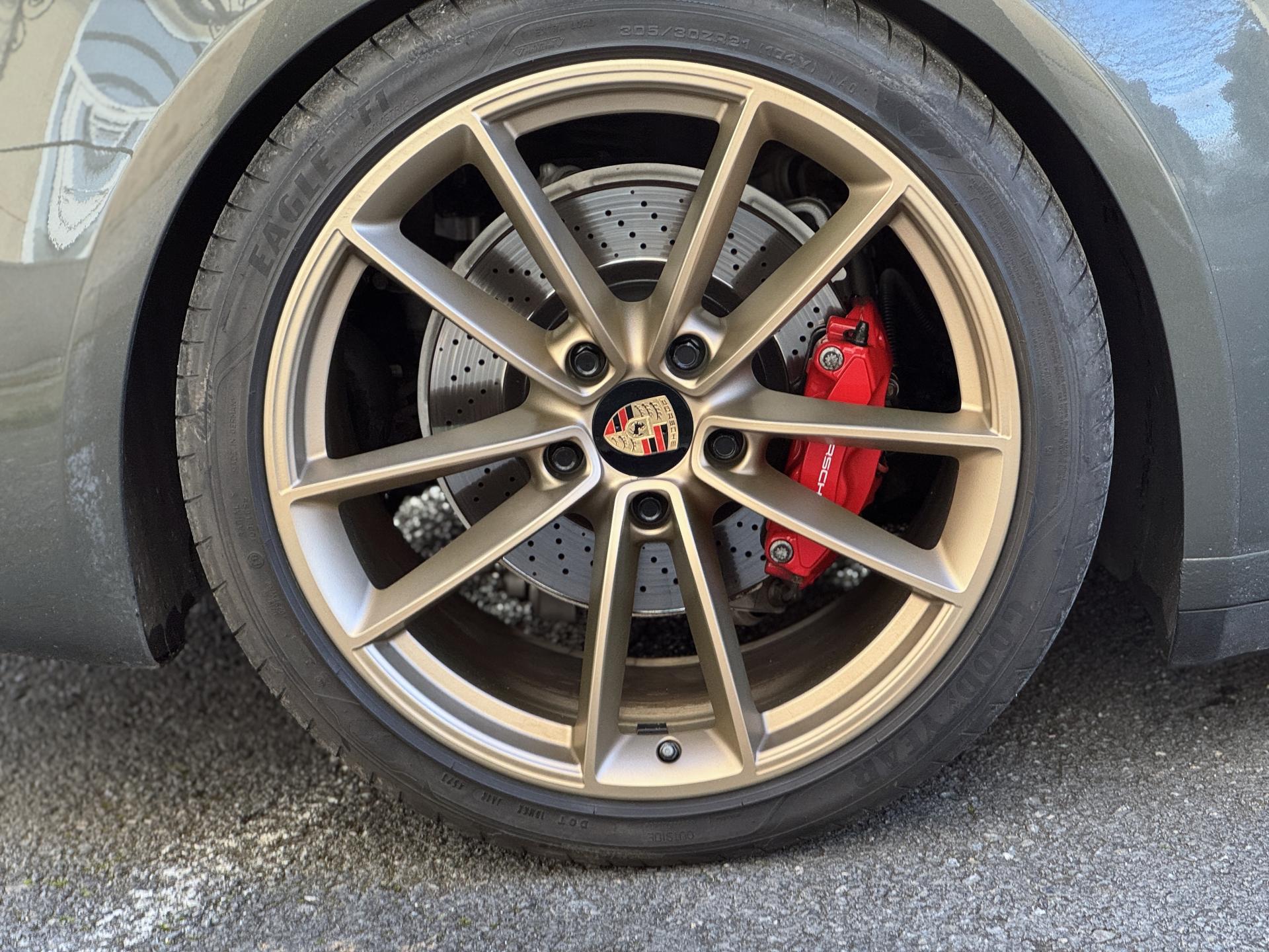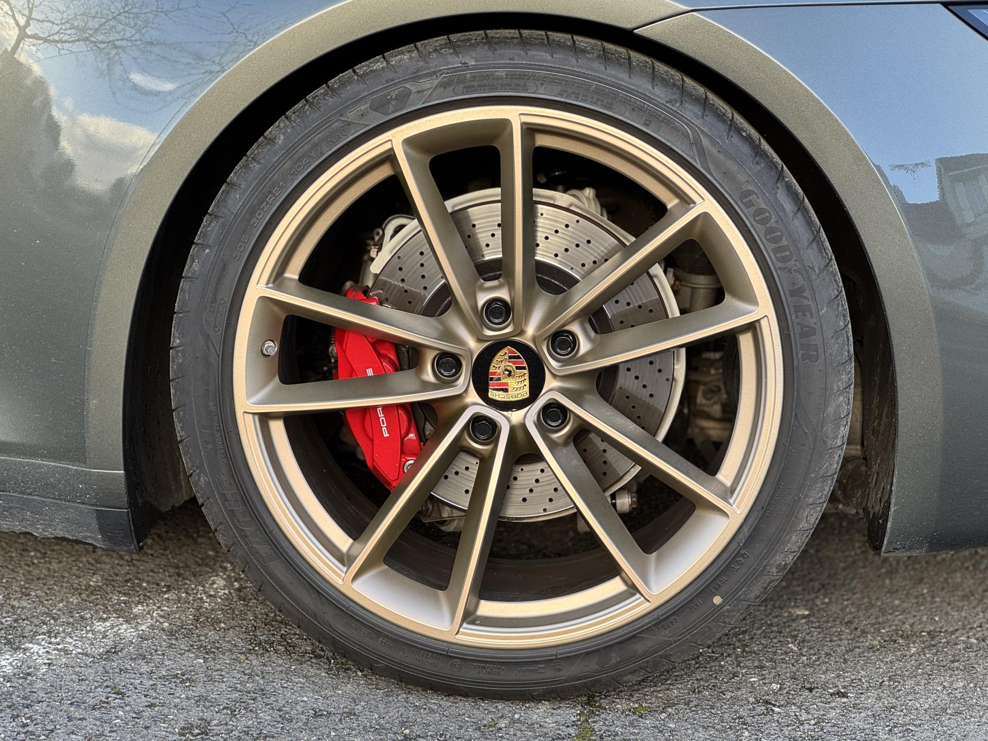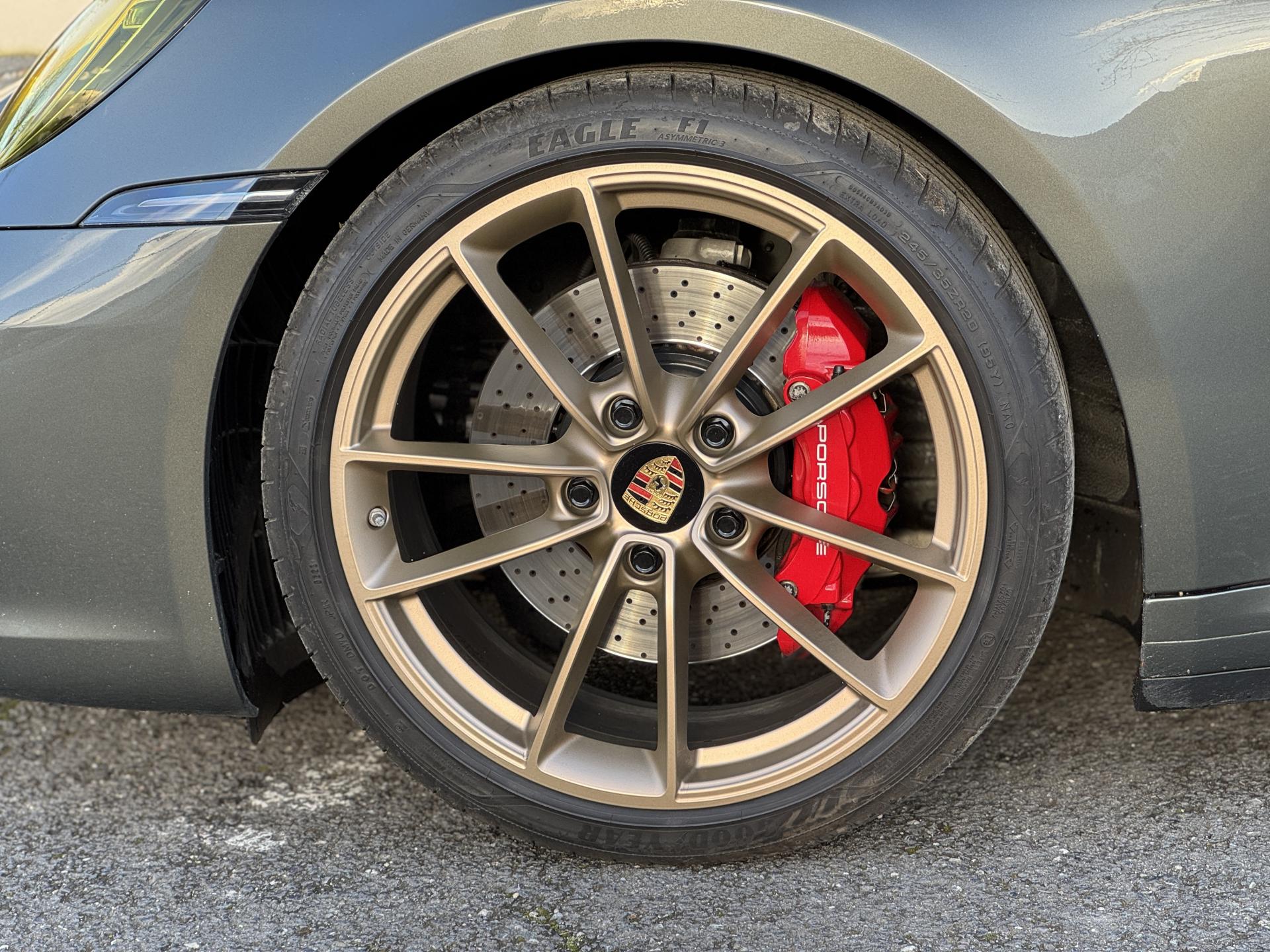 La 911 Type 992 Carrera S incarne la quintessence de la sportivité selon Porsche. Cette génération repousse les limites de la performance tout en conservant l'ADN historique de la marque. Cette configuration en vert Aventure avec jantes dorées satinées d'origine est tout simplement magnifique et rare.